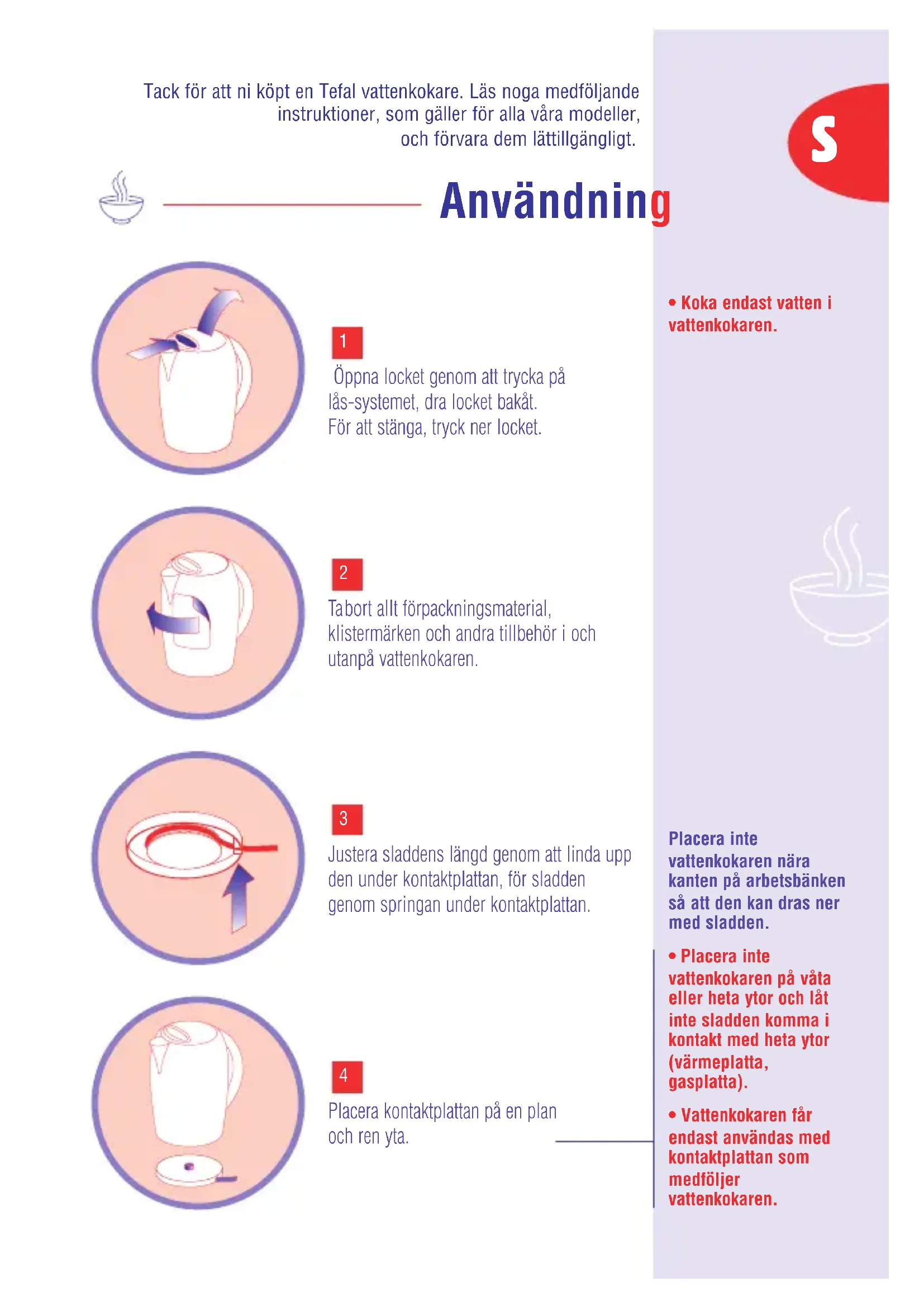 - Koka endast vatten i vattenkokaren. Användning Tack för att ni köpt en Tefal vattenkokare. Läs noga medföljande instruktioner, som gäller för alla våra modeller, och förvara dem lättillgängligt. SKoka ur vattenkokaren 2-3 gånger innan du börjar använda den för att få bort ev. damm. Kontrollera att vatten- kokarens volt tal/watt tal överensstämmer med elinstallationerna i ditt hem.