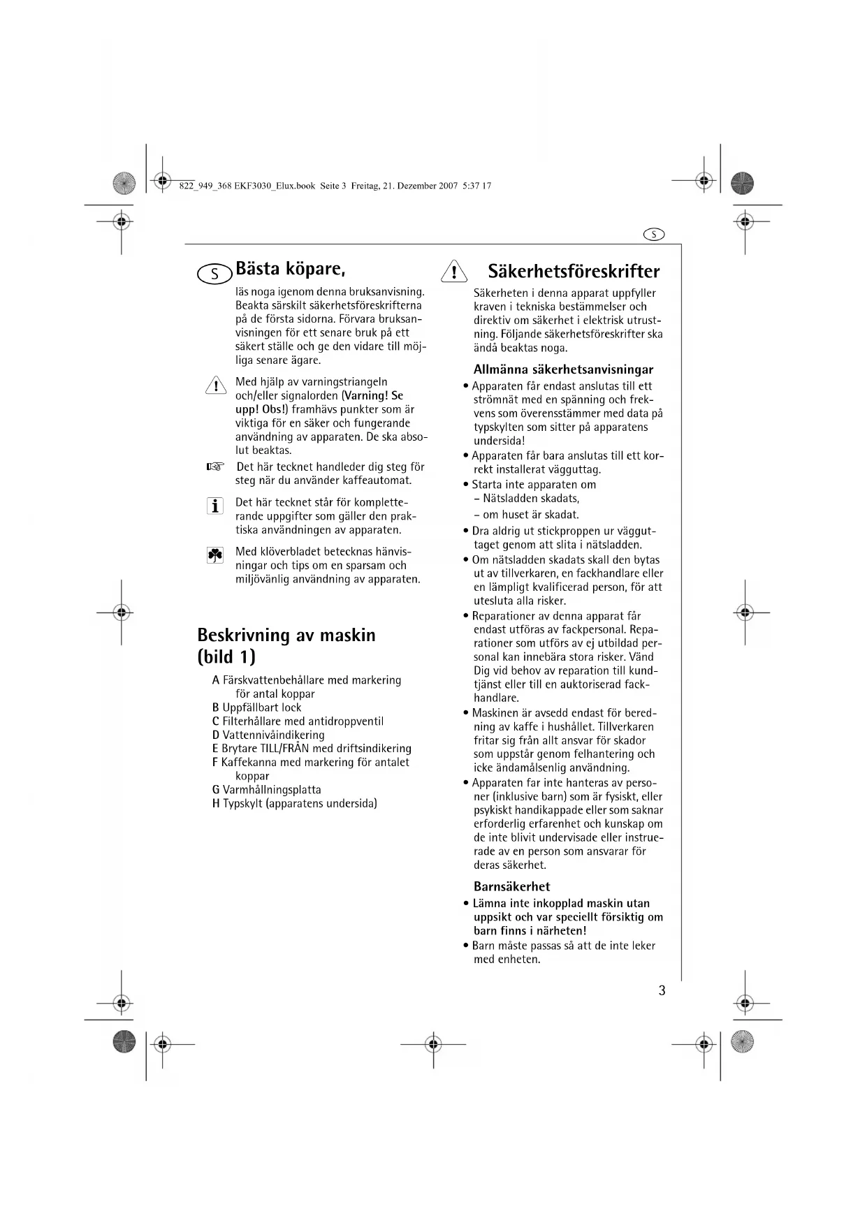 Bästa köpare, läs noga igenom denna bruksanvisning. Beakta särskilt säkerhetsföreskrifterna på de första sidorna. Förvara bruksan-visningen för ett senare bruk på ett säkert ställe och ge den vidare till möj-liga senare ägare. Med hjälp av varningstriangeln och/eller signalorden (Varning! Se upp! Obs!) framhävs punkter som är viktiga för en säker och fungerande användning av apparaten. De ska abso-lut beaktas. 0 Det här tecknet handleder dig steg för steg när du använder kaffeautomat. Det här tecknet står för komplette-rande uppgifter som gäller den prak-tiska användningen av apparaten. Med klöverbladet betecknas hänvis-ningar och tips om en sparsam och miljövänlig användning av apparaten. Beskrivning av maskin (bild 1) A Färskvattenbehållare med markering för antal kopparB Uppfällbart lockC Filterhållare med antidroppventilD VattennivåindikeringE Brytare TILL/FRÅN med driftsindikeringF Kaffekanna med markering för antalet kopparG VarmhållningsplattaH Typskylt (apparatens undersida) 1 Säkerhetsföreskrifter Säkerheten i denna apparat uppfyller kraven i tekniska bestämmelser och direktiv om säkerhet i elektrisk utrust-ning. Följande säkerhetsföreskrifter ska ändå beaktas noga.Allmänna säkerhetsanvisningar• Apparaten får endast anslutas till ett strömnät med en spänning och frek-vens som överensstämmer med data på typskylten som sitter på apparatens undersida!• Apparaten får bara anslutas till ett kor-rekt installerat vägguttag.• Starta inte apparaten om– Nätsladden skadats,– om huset är skadat.• Dra aldrig ut stickproppen ur väggut-taget genom att slita i nätsladden.• Om nätsladden skadats skall den bytas ut av tillverkaren, en fackhandlare eller en lämpligt kvalificerad person, för att utesluta alla risker.• Reparationer av denna apparat får endast utföras av fackpersonal. Repa-rationer som utförs av ej utbildad per-sonal kan innebära stora risker. Vänd Dig vid behov av reparation till kund-tjänst eller till en auktoriserad fack-handlare.• Maskinen är avsedd endast för bered-ning av kaffe i hushållet. Tillverkaren fritar sig från allt ansvar för skador som uppstår genom felhantering och icke ändamålsenlig användning.• Apparaten far inte hanteras av perso-ner (inklusive barn) som är fysiskt, eller psykiskt handikappade eller som saknar erforderlig erfarenhet och kunskap om de inte blivit undervisade eller instrue-rade av en person som ansvarar för deras säkerhet.Barnsäkerhet• Lämna inte inkopplad maskin utan uppsikt och var speciellt försiktig om barn finns i närheten!• Barn måste passas så att de inte leker med enheten.822_949_368 EKF3030_Elux.book Seite 3 Freitag, 21. Dezember 2007 5:37 17s