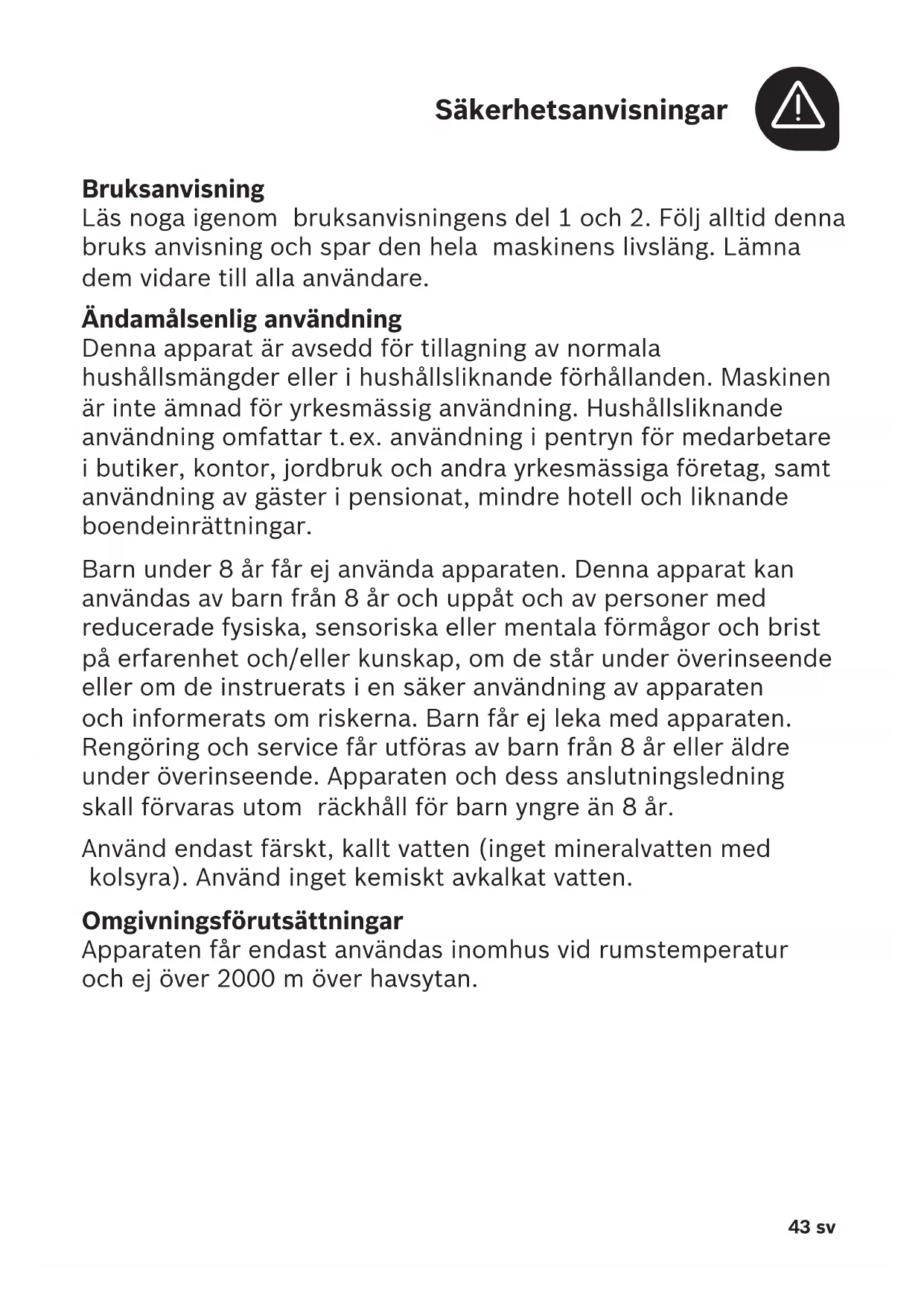 Bruksanvisning Läs noga igenom bruksanvisningens del1och 2. Följ alltid denna bruks anvisning och spar den hela maskinens livsläng. Lämna dem vidare till alla användare. Ändamålsenlig användning Denna apparat är avsedd för tillagning av normala hushållsmängder eller i hushållsliknande förhållanden. Maskinen är inte ämnad för yrkesmässig användning. Hushållsliknande användning omfattar t. ex. användning i pentryn för medarbetare i butiker, kontor, jordbruk och andra yrkesmässiga företag, samt användning av gäster i pensionat, mindre hotell och liknande boendeinrättningar. Barn under 8 år får ej använda apparaten. Denna apparat kan användas av barn från 8 år och uppåt och av personer med reducerade fysiska, sensoriska eller mentala förmågor och brist på erfarenhet och/eller kunskap, om de står under överinseende eller om de instruerats i en säker användning av apparaten och informerats om riskerna. Barn får ej leka med apparaten. Rengöring och service får utföras av barn från 8 år eller äldre under överinseende. Apparaten och dess anslutningsledning skall förvaras utom räckhåll för barn yngre än 8 år. Använd endast färskt, kallt vatten (inget mineralvatten med kolsyra). Använd inget kemiskt avkalkat vatten. Omgivningsförutsättningar Apparaten får endast användas inomhus vid rumstemperatur ochej över 2000m över havsytan.44sv Säkerhetsanvisningar