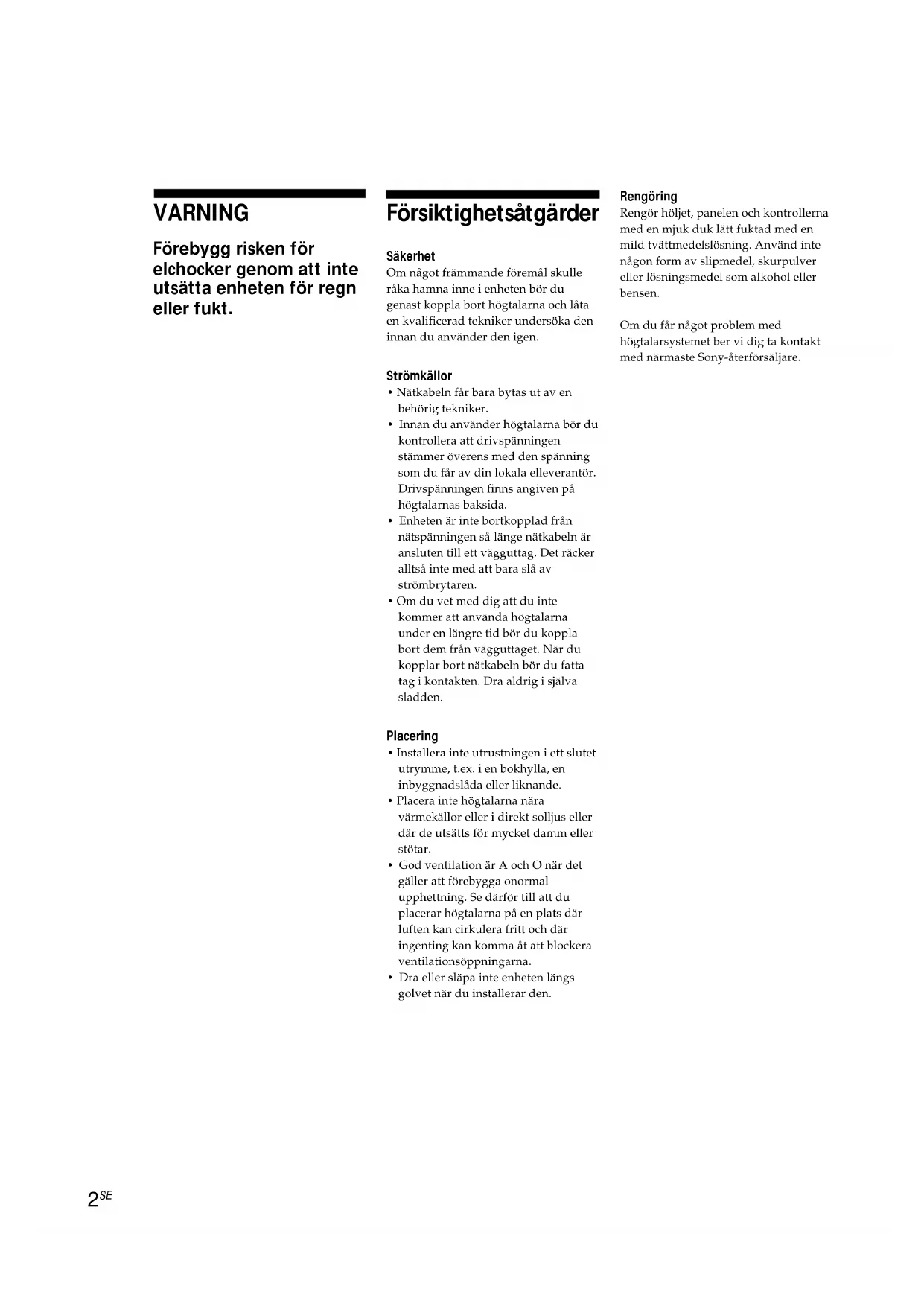 VARNING Förebygg risken för elchocker genom att inte utsätta enheten för regn eller fukt. Försiktighetsåtgärder Säkerhet Om något främmande föremål skulle råka hamna inne i enheten bör du genast koppla bort högtalarna och låta en kvalificerad tekniker undersöka deninnan du använder den igen. Strömkällor