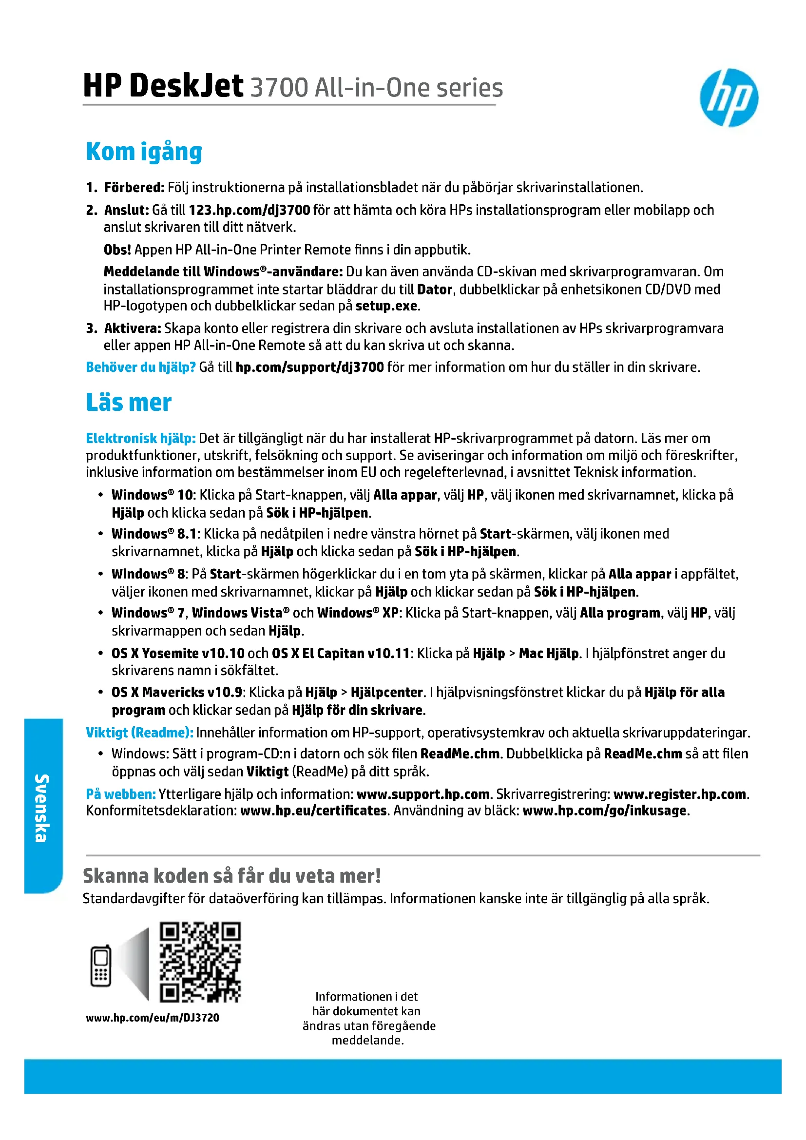 - Windows: Sätt i program-CD:n i datorn och sök len ReadMe.chm. Dubbelklicka på ReadMe.chm så att len öppnas och välj sedan Viktigt (ReadMe) på ditt språk. På webben: Ytterligare hjälp och information: www.support.hp.com. Skrivarregistrering: www.register.hp.com. Konformitetsdeklaration: www.hp.eu/certicates. Användning av bläck: www.hp.com/go/inkusage. HP DeskJet 3700 All-in-One series Skanna koden så får du veta mer! Standardavgifter för dataöverföring kan tillämpas. Informationen kanske inte är tillgänglig på alla språk.Informationen i det här dokumentet kan ändras utan föregående meddelande.Svenska