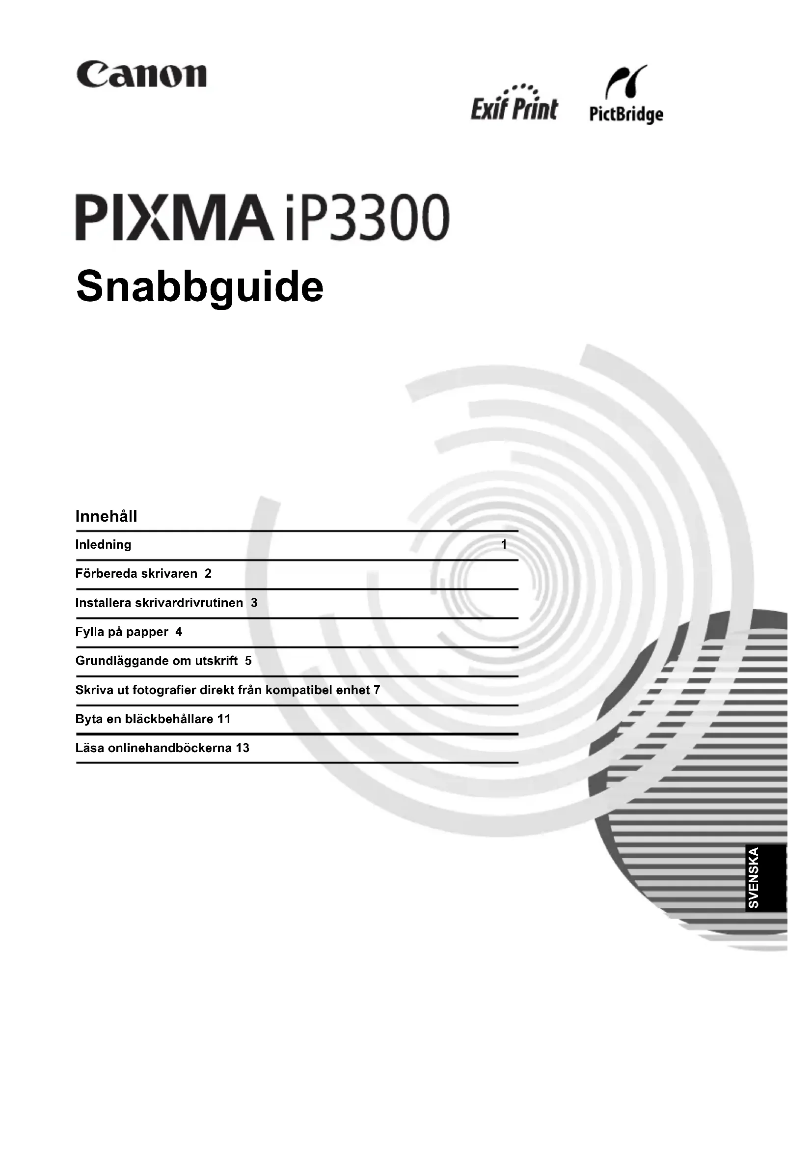 (Euroopan talousalue: Norja, Islanti ja Liechtenstein) Vain käyttäjille Euroopassa, Lähi-idässä, Afrikassa ja Venäjällä Tietoja Canonin asiakastuesta on European Warranty System (EWS) -kirjasen takakannessa ja osoitteessa www.canon-europe.com. Canon Europa N.V., Bovenkerkerweg 59-61, 1185 XB Amstelveen, AlankomaatSVENSKA Snabbguide Innehåll Inledning 1 Förbereda skrivaren 2 Installera skrivardrivrutinen 3 Fylla på papper 4 Grundläggande om utskrift 5 Skriva ut fotografier direkt från kompatibel enhet 7 Byta en bläckbehållare 11 Läsa onlinehandböckerna 13SVENSKA Exif Print Den här skrivaren stöder Exif Print. Exif Print är en standard som förbättrar kommunikationen mellan digitalkameror och skrivare. Genom att ansluta till en Exif Print-kompatibel digitalkamera används och optimeras kamerans bilddata i bildögonblicket vilket ger bildutskrifter med extremt hög kvalitet. Kanadensiska regler om radiostörningar Den här digitala apparaten överskrider inte gränsvärdena för klass B för utsändning av radiobrus från digital utrustning, i enlighet med den kanadensiska industristandarden för störningsorsakande utrustning, ”Digital apparatur”, ICES-003. Cet appareil numérique respecte les limites de bruits radioélectriques applicables aux appareils numériques de Classe B prescrites dans la norme sur le matériel brouilleur NMB- 003 d'Industrie Canada intitulée « Appareils numériques ». Internationellt ENERGY STAR