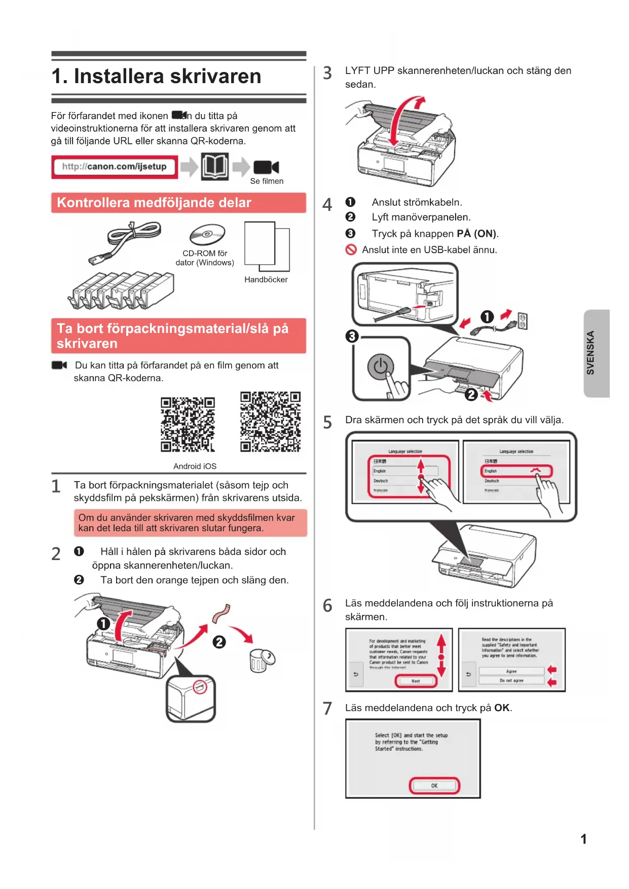 För förfarandet med ikonen kan du titta på videoinstruktionerna för att installera skrivaren genom att gå till följande URL eller skanna QR-koderna. Se lmen Kontrollera medföljande delar CD-ROM för dator (Windows)Handböcker Ta bort förpackningsmaterial/slå på skrivaren Du kan titta på förfarandet på en lm genom att skanna QR-koderna. Android iOS
