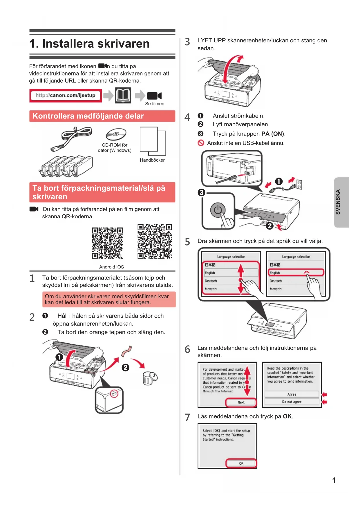 För förfarandet med ikonen kan du titta på videoinstruktionerna för att installera skrivaren genom att gå till följande URL eller skanna QR-koderna. Se lmen Kontrollera medföljande delar CD-ROM för dator (Windows)Handböcker Ta bort förpackningsmaterial/slå på skrivaren Du kan titta på förfarandet på en lm genom att skanna QR-koderna. Android iOS