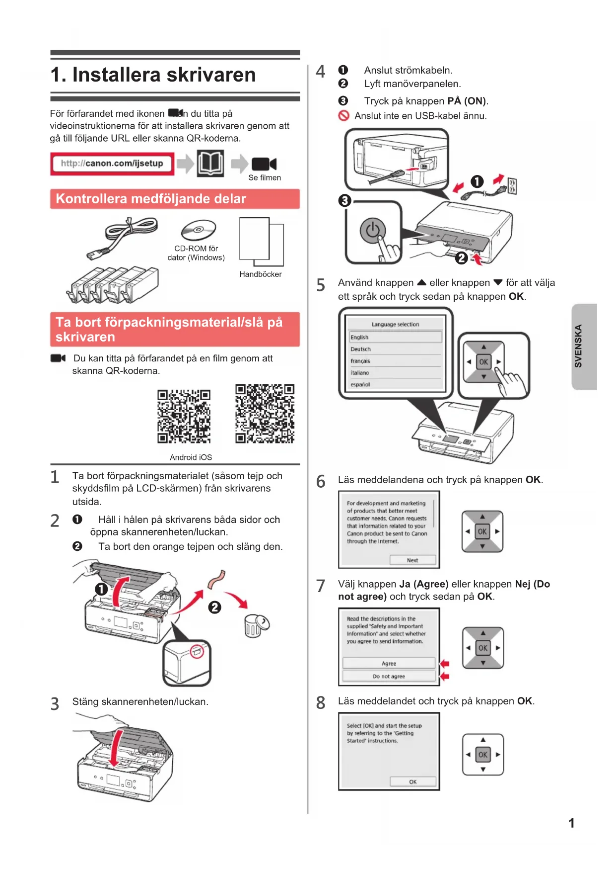 För förfarandet med ikonen kan du titta på videoinstruktionerna för att installera skrivaren genom att gå till följande URL eller skanna QR-koderna. Se lmen Kontrollera medföljande delar CD-ROM för dator (Windows)Handböcker Ta bort förpackningsmaterial/slå på skrivaren Du kan titta på förfarandet på en lm genom att skanna QR-koderna. Android iOS