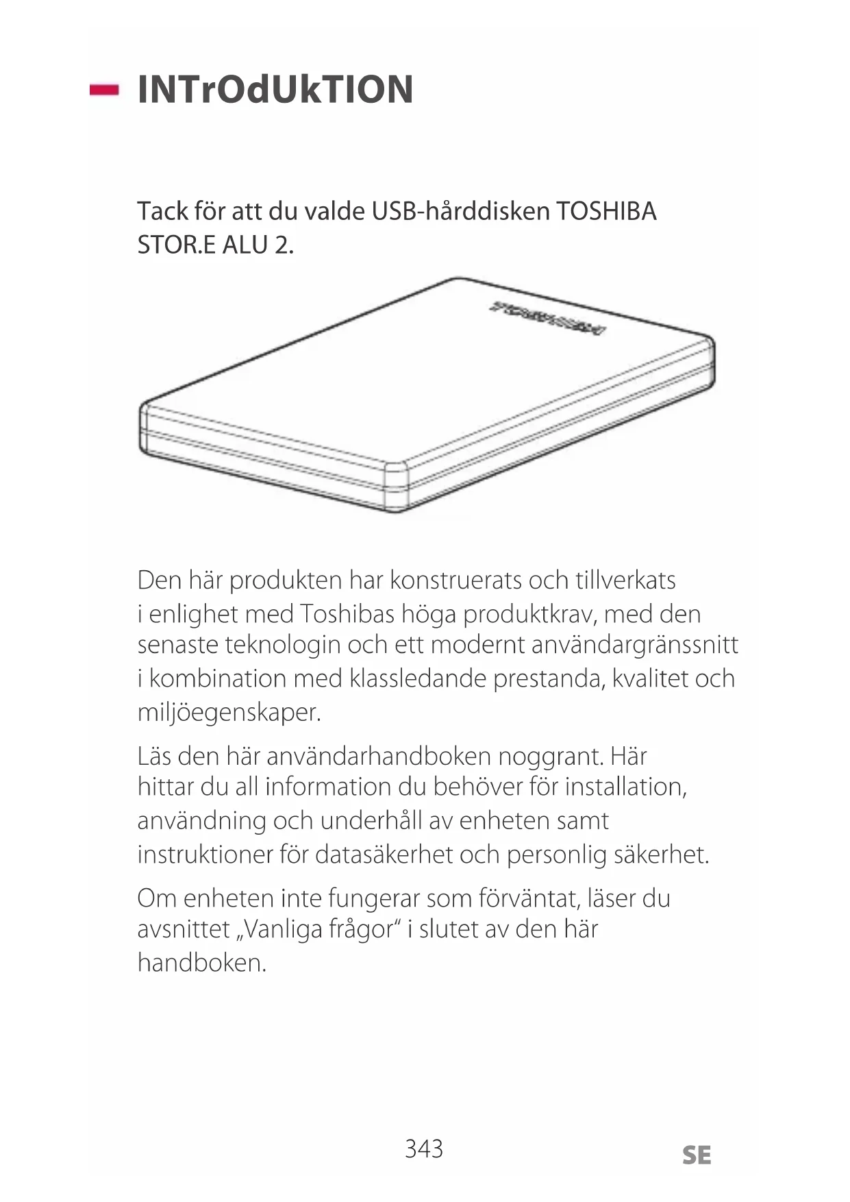 INTrOdUkTION Tack för att du valde USB-hårddisken TOSHIBA STOR.E ALU 2. Den här produkten har konstruerats och tillverkats i enlighet med Toshibas höga produktkrav, med den senaste teknologin och ett modernt användargränssnitt i kombination med klassledande prestanda, kvalitet och miljöegenskaper. Läs den här användarhandboken noggrant. Här hittar du all information du behöver för installation, användning och underhåll av enheten samt instruktioner för datasäkerhet och personlig säkerhet. Om enheten inte fungerar som förväntat, läser du avsnittet „Vanliga frågor“ i slutet av den här handboken.344