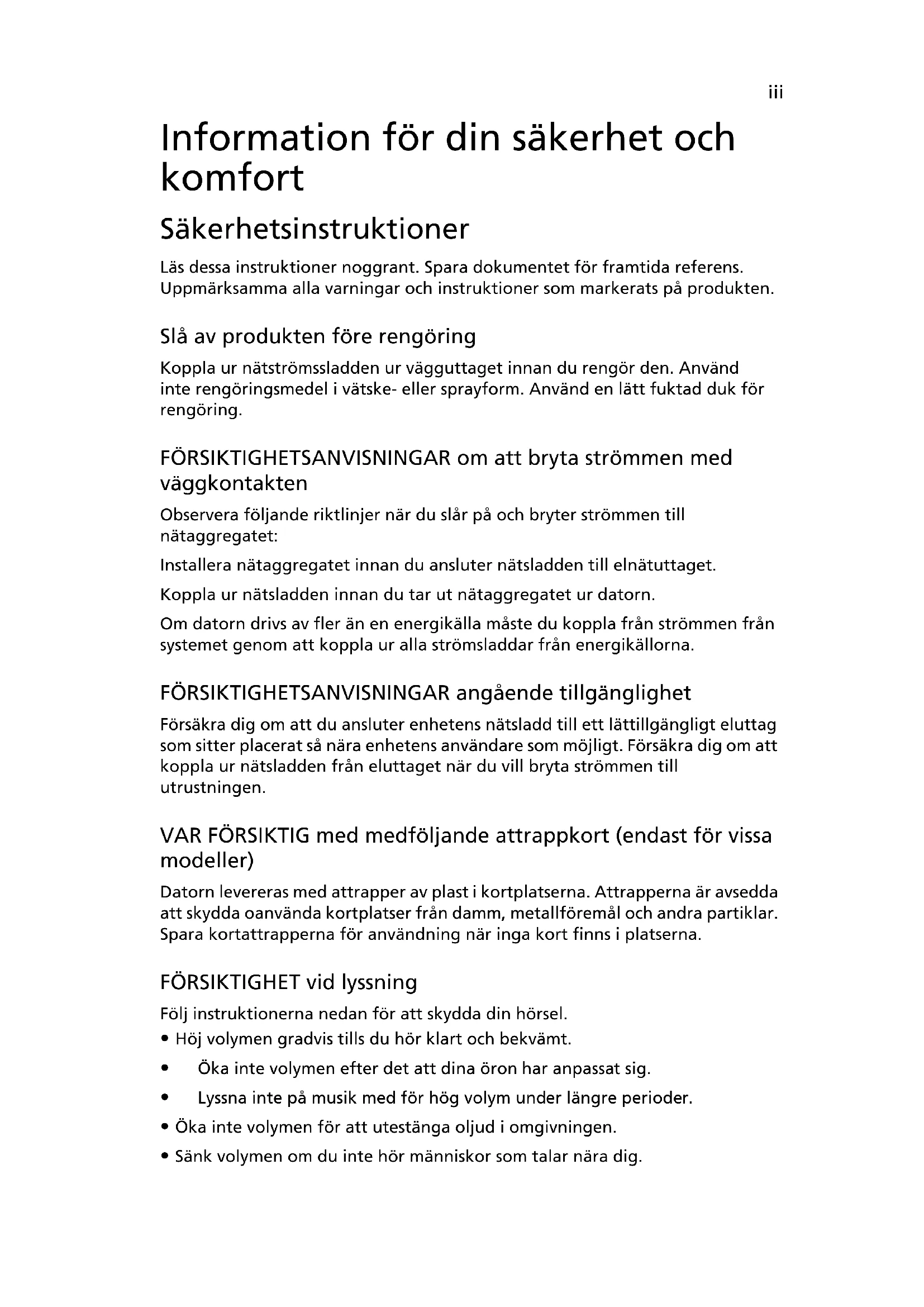 Windows-taster . . . . . . . . . . . . . . . 6Aspire One-serien Allmän användarguideModellnummer: ___________________________________ Serienummer: _____________________________________ Inköpsdatum: _____________________________________ Inköpsställe: _______________________________________ © 2010 Med ensamrätt Aspire One-serien Allmän användarguide Ursprunglig utgåva: 06/2010 Aspire One-serien – bärbar PC-datoriii Information för din säkerhet och komfort Säkerhetsinstruktioner Läs dessa instruktioner noggrant. Spara dokumentet för framtida referens. Uppmärksamma alla varningar och instruktioner som markerats på produkten. Slå av produkten före rengöring Koppla ur nätströmssladden ur vägguttaget innan du rengör den. Använd inte rengöringsmedel i vätske- eller sprayform. Använd en lätt fuktad duk för rengöring. FÖRSIKTIGHETSANVISNINGAR om att bryta strömmen med väggkontakten Observera följande riktlinjer när du slår på och bryter strömmen till nätaggregatet: Installera nätaggregatet innan du ansluter nätsladden till elnätuttaget. Koppla ur nätsladden innan du tar ut nätaggregatet ur datorn. Om datorn drivs av fler än en energikälla måste du koppla från strömmen från systemet genom att koppla ur alla strömsladdar från energikällorna. FÖRSIKTIGHETSANVISNINGAR angående tillgänglighet Försäkra dig om att du ansluter enhetens nätsladd till ett lättillgängligt eluttag som sitter placerat så nära enhetens användare som möjligt. Försäkra dig om att koppla ur nätsladden från eluttaget när du vill bryta strömmen till utrustningen. VAR FÖRSIKTIG med medföljande attrappkort (endast för vissa modeller) Datorn levereras med attrapper av plast i kortplatserna. Attrapperna är avsedda att skydda oanvända kortplatser från damm, metallföremål och andra partiklar. Spara kortattrapperna för användning när inga kort finns i platserna. FÖRSIKTIGHET vid lyssning Följ instruktionerna nedan för att skydda din hörsel.