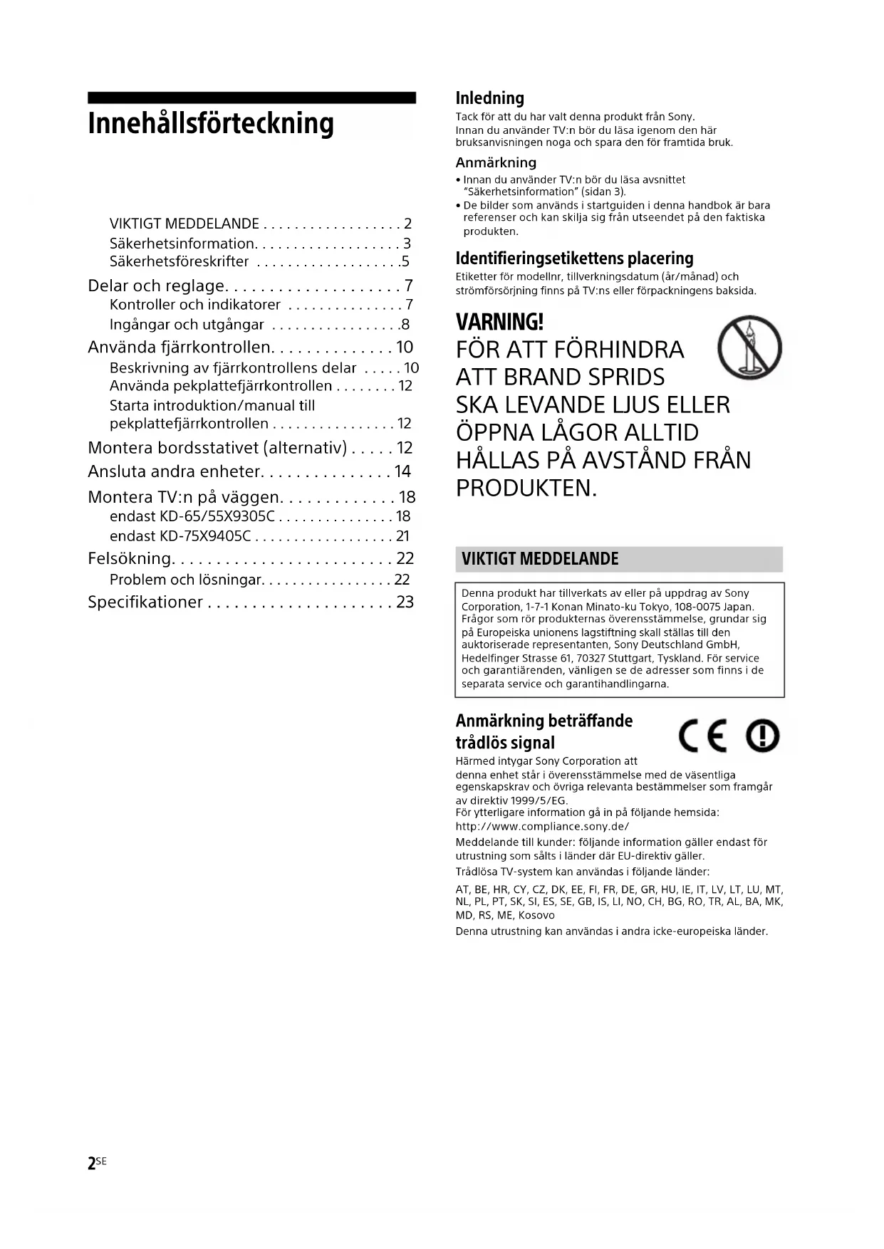 - Specifikationer Inledning Tack för att du har valt denna produkt från Sony. Innan du använder TV:n bör du läsa igenom den här bruksanvisningen noga och spara den för framtida bruk.Anmärkning• Innan du använder TV:n bör du läsa avsnittet “Säkerhetsinformation” (sidan 3). • De bilder som används i startguiden i denna handbok är bara referenser och kan skilja sig från utseendet på den faktiska produkten. Identifieringsetikettens placering Etiketter för modellnr, tillverkningsdatum (år/månad) och strömförsörjning finns på TV:ns eller förpackningens baksida. VARNING! p. 23