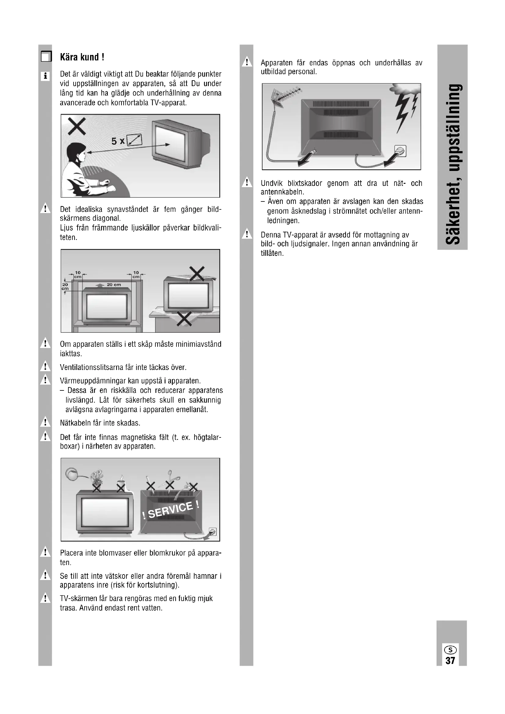 Denna TV-apparat är avsedd för mottagning avbild- och ljudsignaler. Ingen annan användning ärtillåten. Kära kund !Det är väldigt viktigt att Du beaktar följande punktervid uppställningen av apparaten, så att Du underlång tid kan ha glädje och underhållning av dennaavancerade och komfortabla TV-apparat.