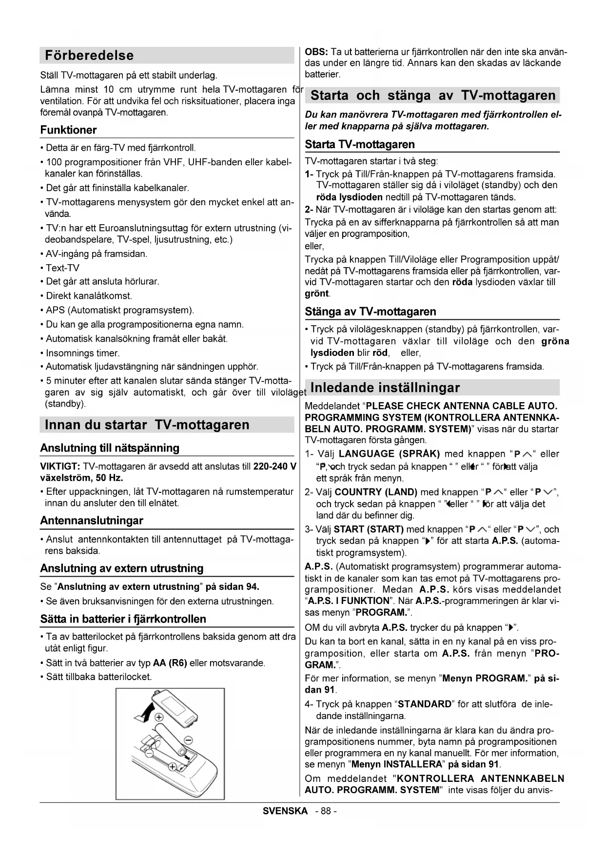 Blixtsymbolen med pilen, inom en liksidig triangel, är avsedd att visa användaren att det finns friliggande farlig spän- ning inuti produktens hölje, och denna spänning kan vara tillräcklig för att orsaka elchock. Utropstecknet inom en liksidig triangel är avsett att visa användaren att det finns viktiga anvisningar för användning och underhåll (service) i den litteratur som följde med apparaten.SVENSKA - 87 - Knappar på frontpanelen Antennanslutningar AV14BM8ENS AV14BJ8ENSSVENSKA - 88 - Förberedelse Ställ TV-mottagaren på ett stabilt underlag. Lämna minst 10 cm utrymme runt hela TV-mottagaren för ventilation. För att undvika fel och risksituationer, placera inga föremål ovanpå TV-mottagaren. Funktioner Detta är en färg-TV med fjärrkontroll. 100 programpositioner från VHF, UHF-banden eller kabel- kanaler kan förinställas. Det går att fininställa kabelkanaler. TV-mottagarens menysystem gör den mycket enkel att an- vända. TV:n har ett Euroanslutningsuttag för extern utrustning (vi- deobandspelare, TV-spel, ljusutrustning, etc.) AV-ingång på framsidan. Text-TV Det går att ansluta hörlurar. Direkt kanalåtkomst. APS (Automatiskt programsystem). Du kan ge alla programpositionerna egna namn. Automatisk kanalsökning framåt eller bakåt. Insomnings timer. Automatisk ljudavstängning när sändningen upphör. 5 minuter efter att kanalen slutar sända stänger TV-motta- garen av sig själv automatiskt, och går över till viloläget (standby). Innan du startar TV-mottagaren Anslutning till nätspänning VIKTIGT: TV-mottagaren är avsedd att anslutas till 220-240 V växelström, 50 Hz. Efter uppackningen, låt TV-mottagaren nå rumstemperatur innan du ansluter den till elnätet. Antennanslutningar Anslut antennkontakten till antennuttaget på TV-mottaga- rens baksida. Anslutning av extern utrustning Se Anslutning av extern utrustning på sidan 94. Se även bruksanvisningen för den externa utrustningen. Sätta in batterier i fjärrkontrollen Ta av batterilocket på fjärrkontrollens baksida genom att dra utåt enligt figur. Sätt in två batterier av typ AA (R6) eller motsvarande. Sätt tillbaka batterilocket. OBS: Ta ut batterierna ur fjärrkontrollen när den inte ska använ- das under en längre tid. Annars kan den skadas av läckande batterier. Starta och stänga av TV-mottagaren Du kan manövrera TV-mottagaren med fjärrkontrollen el- ler med knapparna på själva mottagaren. Starta TV-mottagaren TV-mottagaren startar i två steg: