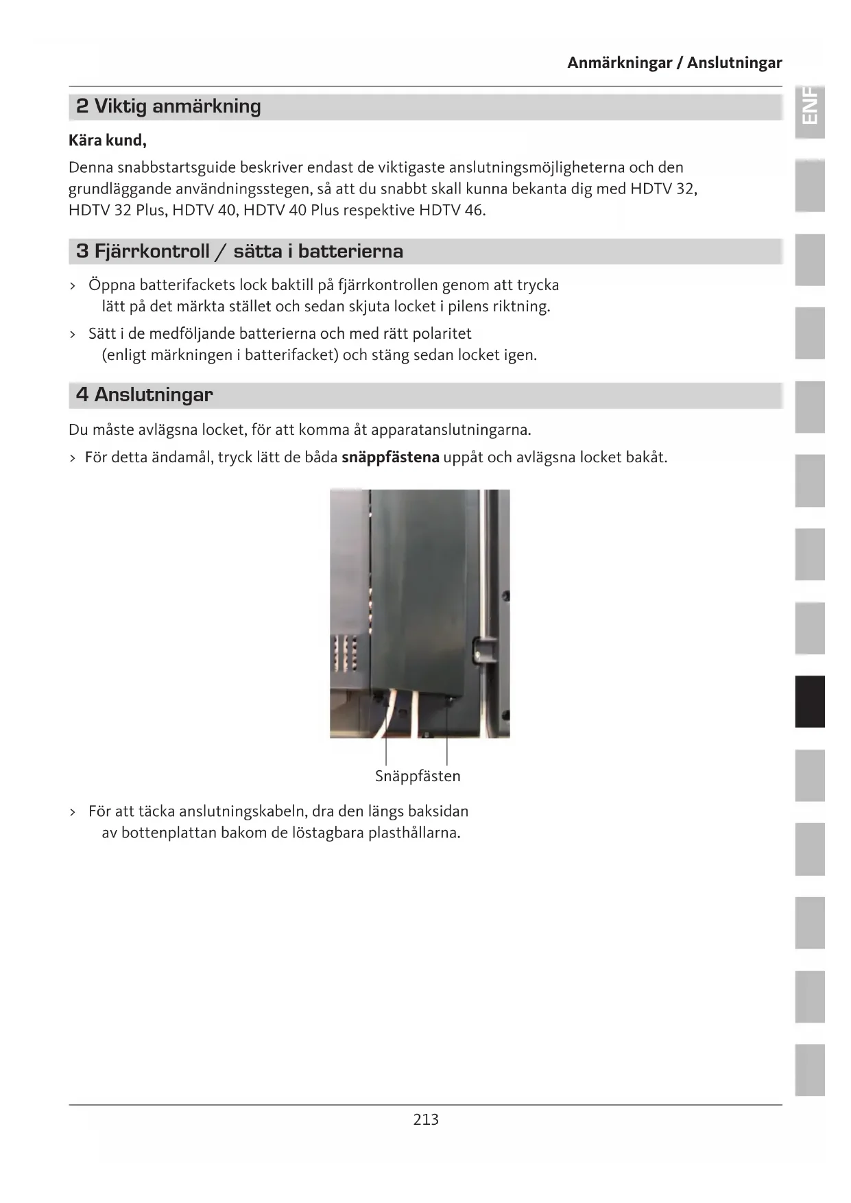 ENFRESITGRNLNODASVFIPLCZHURU Anmärkningar / Anslutningar 2 Viktig anmärkning Kära kund, Denna snabbstartsguide beskriver endast de viktigaste anslutningsmöjligheterna och den grundläggande användningsstegen, så att du snabbt skall kunna bekanta dig med HDTV 32, HDTV 32 Plus, HDTV 40, HDTV 40 Plus respektive HDTV 46. 3 Fjärrkontroll / sätta i batterierna > Öppna batterifackets lock baktill på fjärrkontrollen genom att trycka lätt på det märkta stället och sedan skjuta locket i pilens riktning. > Sätt i de medföljande batterierna och med rätt polaritet (enligt märkningen i batterifacket) och stäng sedan locket igen. 4 Anslutningar Du måste avlägsna locket, för att komma åt apparatanslutningarna. > För detta ändamål, tryck lätt de båda snäppfästena uppåt och avlägsna locket bakåt. > För att täcka anslutningskabeln, dra den längs baksidan av bottenplattan bakom de löstagbara plasthållarna. Snäppfästen214 Anslutningar