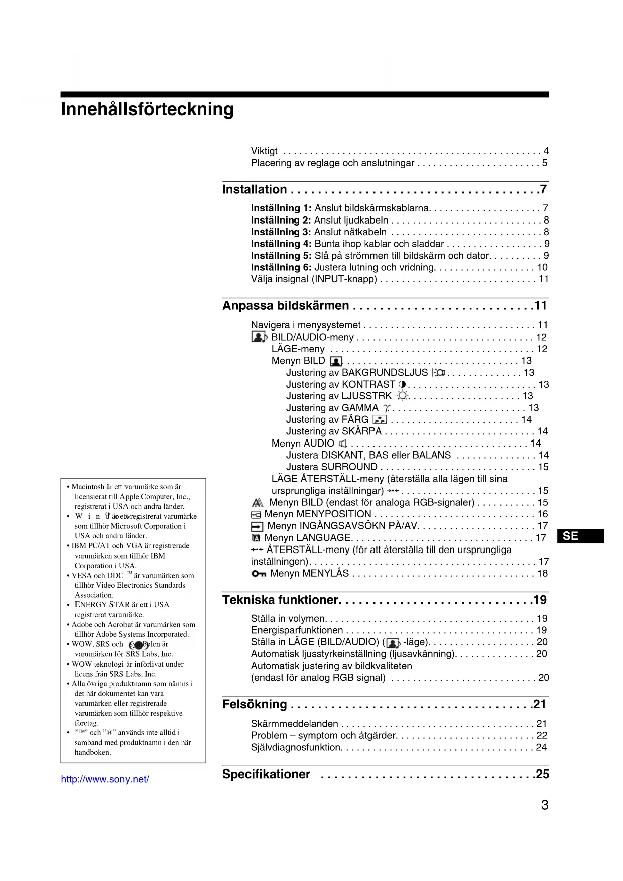 - ”” och ”” används inte alltid i samband med produktnamn i den här handboken. http://www.sony.net/ Viktigt . . . . . . . . . . . . . . . . . . . . . . . . . . . . . . . . . . . . . . . . . . . . . . . . 4 Placering av reglage och anslutningar . . . . . . . . . . . . . . . . . . . . . . . 5 Installation . . . . . . . . . . . . . . . . . . . . . . . . . . . . . . . . . . . . .7 Inställning 1: Anslut bildskärmskablarna. . . . . . . . . . . . . . . . . . . . . 7 Inställning 2: Anslut ljudkabeln . . . . . . . . . . . . . . . . . . . . . . . . . . . . 8 Inställning 3: Anslut nätkabeln . . . . . . . . . . . . . . . . . . . . . . . . . . . . 8 Inställning 4: Bunta ihop kablar och sladdar . . . . . . . . . . . . . . . . . . 9 Inställning 5: Slå på strömmen till bildskärm och dator. . . . . . . . . . 9 Inställning 6: Justera lutning och vridning. . . . . . . . . . . . . . . . . . . 10 Välja insignal (INPUT-knapp) . . . . . . . . . . . . . . . . . . . . . . . . . . . . . 11 Anpassa bildskärmen . . . . . . . . . . . . . . . . . . . . . . . . . . .11 Navigera i menysystemet . . . . . . . . . . . . . . . . . . . . . . . . . . . . . . . . 11 BILD/AUDIO-meny . . . . . . . . . . . . . . . . . . . . . . . . . . . . . . . . . 12 LÄGE-meny . . . . . . . . . . . . . . . . . . . . . . . . . . . . . . . . . . . . . . 12 Menyn BILD . . . . . . . . . . . . . . . . . . . . . . . . . . . . . . . . . . . 13 Justering av BAKGRUNDSLJUS . . . . . . . . . . . . . . . . 13 Justering av KONTRAST 6 . . . . . . . . . . . . . . . . . . . . . . . . 13 Justering av LJUSSTRK . . . . . . . . . . . . . . . . . . . . . . . 13 Justering av GAMMA . . . . . . . . . . . . . . . . . . . . . . . . . . 13 Justering av FÄRG . . . . . . . . . . . . . . . . . . . . . . . . . . . 14 Justering av SKÄRPA . . . . . . . . . . . . . . . . . . . . . . . . . . . . 14 Menyn AUDIO . . . . . . . . . . . . . . . . . . . . . . . . . . . . . . . . . . . 14 Justera DISKANT, BAS eller BALANS . . . . . . . . . . . . . . . 14 Justera SURROUND . . . . . . . . . . . . . . . . . . . . . . . . . . . . . 15 LÄGE ÅTERSTÄLL-meny (återställa alla lägen till sina ursprungliga inställningar) 0 . . . . . . . . . . . . . . . . . . . . . . . . . 15 Menyn BILD (endast för analoga RGB-signaler) . . . . . . . . . . . 15 Menyn MENYPOSITION . . . . . . . . . . . . . . . . . . . . . . . . . . . . . . 16 Menyn INGÅNGSAVSÖKN PÅ/AV. . . . . . . . . . . . . . . . . . . . . . 17 Menyn LANGUAGE. . . . . . . . . . . . . . . . . . . . . . . . . . . . . . . . . . 17 0 ÅTERSTÄLL-meny (för att återställa till den ursprungliga inställningen). . . . . . . . . . . . . . . . . . . . . . . . . . . . . . . . . . . . . . . . . . 17 Menyn MENYLÅS . . . . . . . . . . . . . . . . . . . . . . . . . . . . . . . . . . 18 Tekniska funktioner. . . . . . . . . . . . . . . . . . . . . . . . . . . . .19 Ställa in volymen. . . . . . . . . . . . . . . . . . . . . . . . . . . . . . . . . . . . . . . 19 Energisparfunktionen . . . . . . . . . . . . . . . . . . . . . . . . . . . . . . . . . . . 19 Ställa in LÄGE (BILD/AUDIO) ( -läge). . . . . . . . . . . . . . . . . . . . 20 Automatisk ljusstyrkeinställning (ljusavkänning). . . . . . . . . . . . . . . 20 Automatisk justering av bildkvaliteten (endast för analog RGB signal) . . . . . . . . . . . . . . . . . . . . . . . . . . . 20 Felsökning . . . . . . . . . . . . . . . . . . . . . . . . . . . . . . . . . . . .21 Skärmmeddelanden . . . . . . . . . . . . . . . . . . . . . . . . . . . . . . . . . . . . 21 Problem – symptom och åtgärder. . . . . . . . . . . . . . . . . . . . . . . . . . 22 Självdiagnosfunktion. . . . . . . . . . . . . . . . . . . . . . . . . . . . . . . . . . . . 24 Specifikationer . . . . . . . . . . . . . . . . . . . . . . . . . . . . . . . .254 Viktigt Varning om strömanslutningar