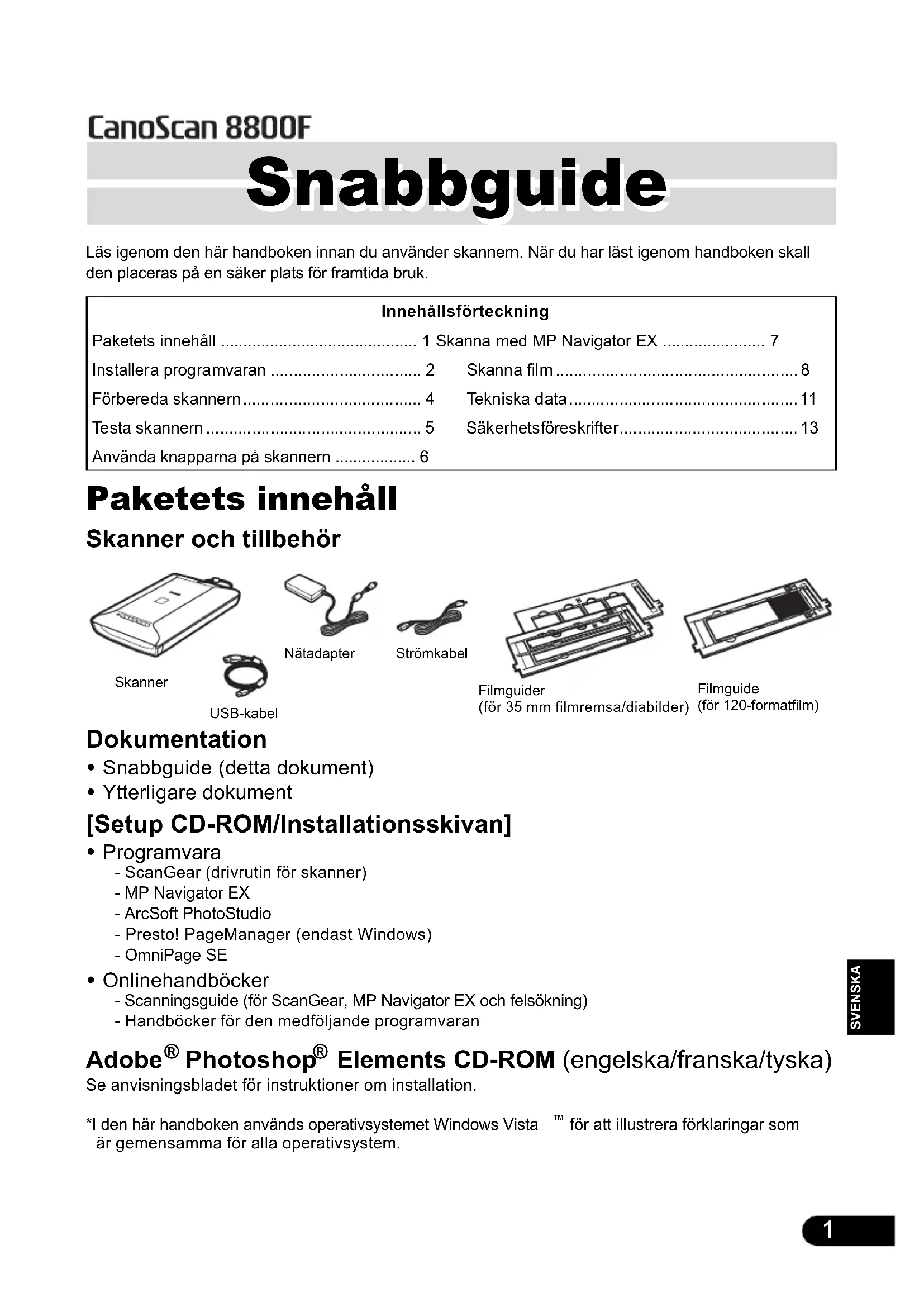 - Elements CD-ROM (engelska/franska/tyska) Se anvisningsbladet för instruktioner om installation.*I den här handboken används operativsystemet Windows Vista för att illustrera förklaringar som är gemensamma för alla operativsystem.InnehållsförteckningPaketets innehåll p. 1