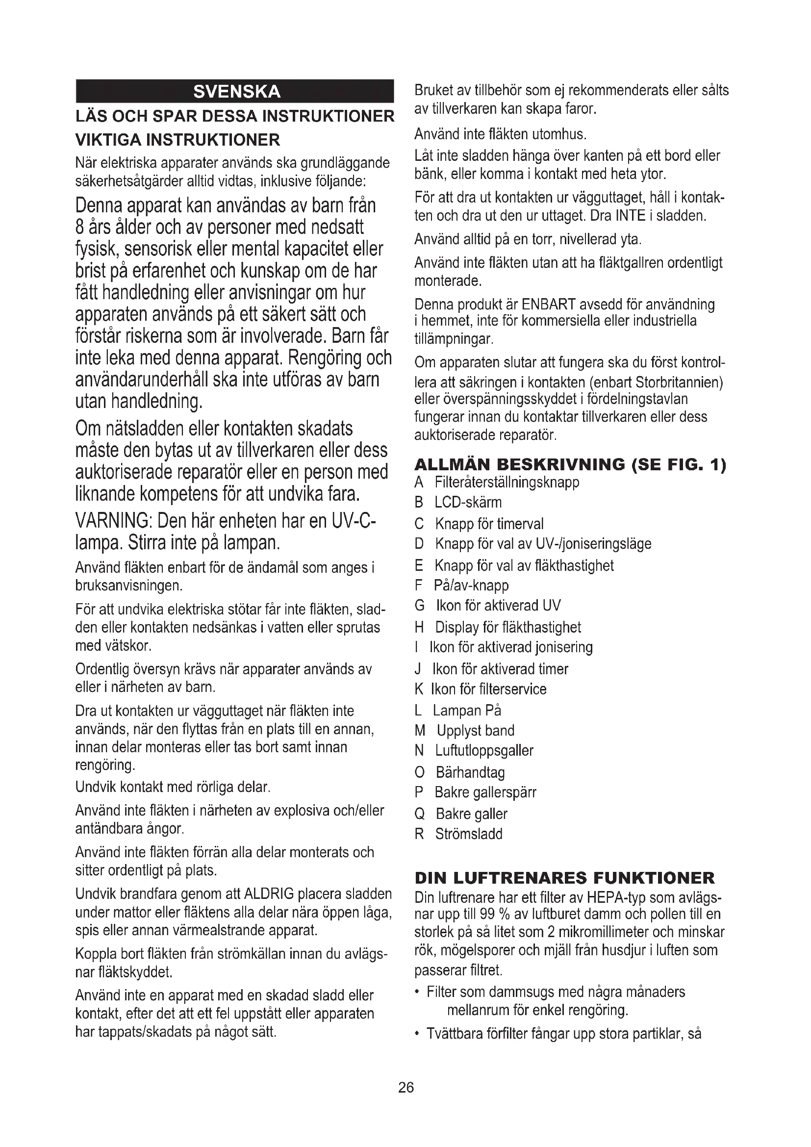 VIKTIGA INSTRUKTIONER När elektriska apparater används ska grundläggande säkerhetsåtgärder alltid vidtas, inklusive följande: Denna apparat kan användas av barn från 8 års ålder och av personer med nedsatt fysisk, sensorisk eller mental kapacitet eller brist på erfarenhet och kunskap om de har fått handledning eller anvisningar om hur apparaten används på ett säkert sätt och förstår riskerna som är involverade. Barn får inte leka med denna apparat. Rengöring och användarunderhåll ska inte utföras av barn utan handledning. Om nätsladden eller kontakten skadats måste den bytas ut av tillverkaren eller dess auktoriserade reparatör eller en person med liknande kompetens för att undvika fara. VARNING: Den här enheten har en UV-C- lampa. Stirra inte på lampan. Använd äkten enbart för de ändamål som anges i bruksanvisningen. För att undvika elektriska stötar får inte äkten, slad- den eller kontakten nedsänkas i vatten eller sprutas med vätskor. Ordentlig översyn krävs när apparater används av eller i närheten av barn. Dra ut kontakten ur vägguttaget när äkten inte används, när den yttas från en plats till en annan, innan delar monteras eller tas bort samt innan rengöring. Undvik kontakt med rörliga delar. Använd inte äkten i närheten av explosiva och/eller antändbara ångor. Använd inte äkten förrän alla delar monterats och sitter ordentligt på plats. Undvik brandfara genom att ALDRIG placera sladden under mattor eller äktens alla delar nära öppen låga, spis eller annan värmealstrande apparat. Koppla bort äkten från strömkällan innan du avlägs- nar äktskyddet. Använd inte en apparat med en skadad sladd eller kontakt, efter det att ett fel uppstått eller apparaten har tappats/skadats på något sätt. Bruket av tillbehör som ej rekommenderats eller sålts av tillverkaren kan skapa faror. Använd inte äkten utomhus. Låt inte sladden hänga över kanten på ett bord eller bänk, eller komma i kontakt med heta ytor. För att dra ut kontakten ur vägguttaget, håll i kontak- ten och dra ut den ur uttaget. Dra INTE i sladden. Använd alltid på en torr, nivellerad yta. Använd inte äkten utan att ha äktgallren ordentligt monterade. Denna produkt är ENBART avsedd för användning i hemmet, inte för kommersiella eller industriella tillämpningar. Om apparaten slutar att fungera ska du först kontrol- lera att säkringen i kontakten (enbart Storbritannien) eller överspänningsskyddet i fördelningstavlan fungerar innan du kontaktar tillverkaren eller dess auktoriserade reparatör. ALLMÄN BESKRIVNING (SE FIG. 1) A Filteråterställningsknapp B LCD-skärm C Knapp för timerval D Knapp för val av UV-/joniseringsläge E Knapp för val av äkthastighet F På/av-knapp G Ikon för aktiverad UV H Display för äkthastighet I Ikon för aktiverad jonisering J Ikon för aktiverad timer K Ikon för lterservice L Lampan På M Upplyst band N Luftutloppsgaller O Bärhandtag P Bakre gallerspärr Q Bakre galler R Strömsladd
