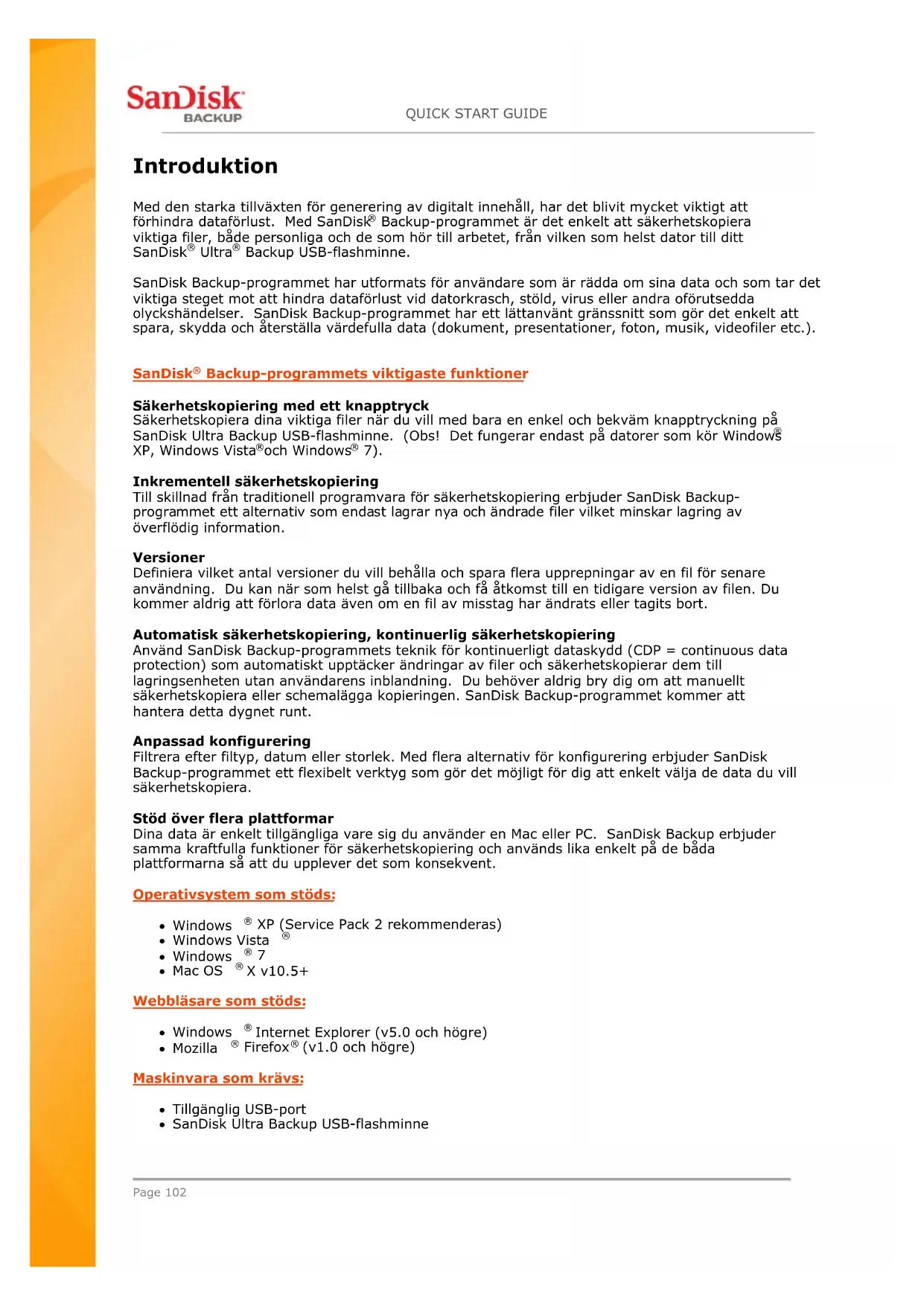 (v1.0 och högre) Maskinvara som krävs: Tillgänglig USB-port SanDisk Ultra Backup USB-flashminneQUICK START GUIDE