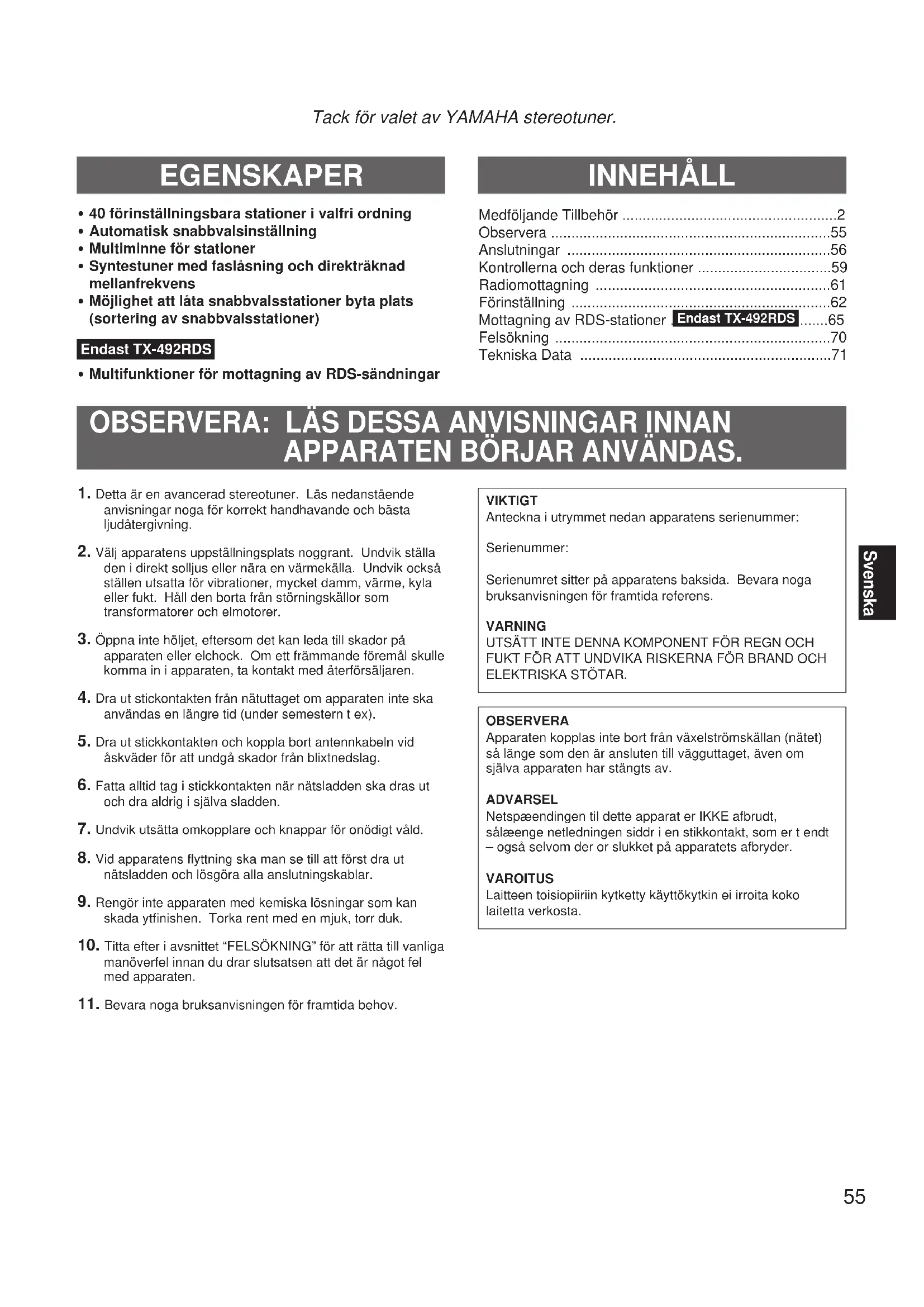 - Tekniska Data . Detta är en avancerad stereotuner. Läs nedanståendeanvisningar noga för korrekt handhavande och bästaljudåtergivning.2. Välj apparatens uppställningsplats noggrant. Undvik ställaden i direkt solljus eller nära en värmekälla. Undvik ocksåställen utsatta för vibrationer, mycket damm, värme, kylaeller fukt. Håll den borta från störningskällor somtransformatorer och elmotorer.3. Öppna inte höljet, eftersom det kan leda till skador påapparaten eller elchock. Om ett främmande föremål skullekomma in i apparaten, ta kontakt med återförsäljaren.4. Dra ut stickontakten från nätuttaget om apparaten inte skaanvändas en längre tid (under semestern t ex).5. Dra ut stickkontakten och koppla bort antennkabeln vidåskväder för att undgå skador från blixtnedslag.6. Fatta alltid tag i stickkontakten när nätsladden ska dras utoch dra aldrig i själva sladden.7. Undvik utsätta omkopplare och knappar för onödigt våld.8. Vid apparatens flyttning ska man se till att först dra utnätsladden och lösgöra alla anslutningskablar.9. Rengör inte apparaten med kemiska lösningar som kanskada ytfinishen. Torka rent med en mjuk, torr duk.10. Titta efter i avsnittet “FELSÖKNING” för att rätta till vanligamanöverfel innan du drar slutsatsen att det är något felmed apparaten.11. Bevara noga bruksanvisningen för framtida behov.VIKTIGTAnteckna i utrymmet nedan apparatens serienummer:Serienummer:Serienumret sitter på apparatens baksida. Bevara nogabruksanvisningen för framtida referens.VARNINGUTSÄTT INTE DENNA KOMPONENT FÖR REGN OCHFUKT FÖR ATT UNDVIKA RISKERNA FÖR BRAND OCHELEKTRISKA STÖTAR.OBSERVERAApparaten kopplas inte bort från växelströmskällan (nätet)så länge som den är ansluten till vägguttaget, även omsjälva apparaten har stängts av.ADVARSELNetspæendingen til dette apparat er IKKE afbrudt,sålæenge netledningen siddr i en stikkontakt, som er t endt– også selvom der or slukket på apparatets afbryder.VAROITUSLaitteen toisiopiiriin kytketty käyttökytkin ei irroita kokolaitetta verkosta.Endast TX-492RDSEndast TX-492RDS56 Anslut aldrig denna och andra apparaters nätkabel förrän samtliga andra anslutningar är klara. ANTENNANSLUTNINGAR p. 711