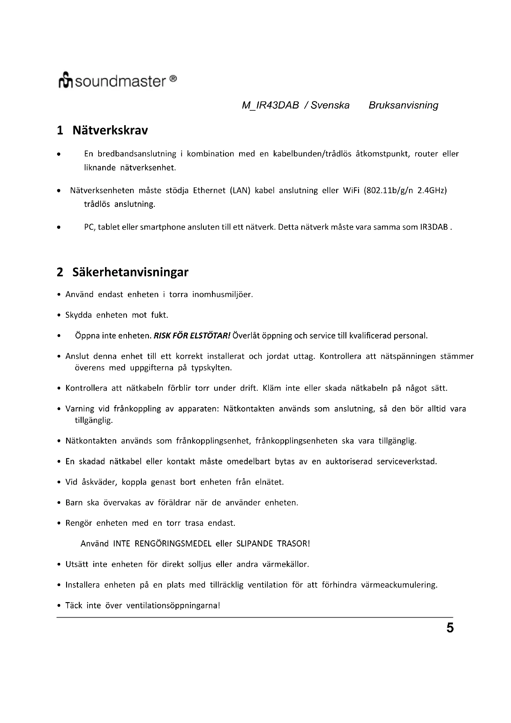 En bredbandsanslutning i kombination med en kabelbunden/trådlös åtkomstpunkt, router eller liknande nätverksenhet. Nätverksenheten måste stödja Ethernet (LAN) kabel anslutning eller WiFi (802.11b/g/n 2.4GHz) trådlös anslutning. PC, tablet eller smartphone ansluten till ett nätverk. Detta nätverk måste vara samma som IR3DAB . 2 Säkerhetanvisningar