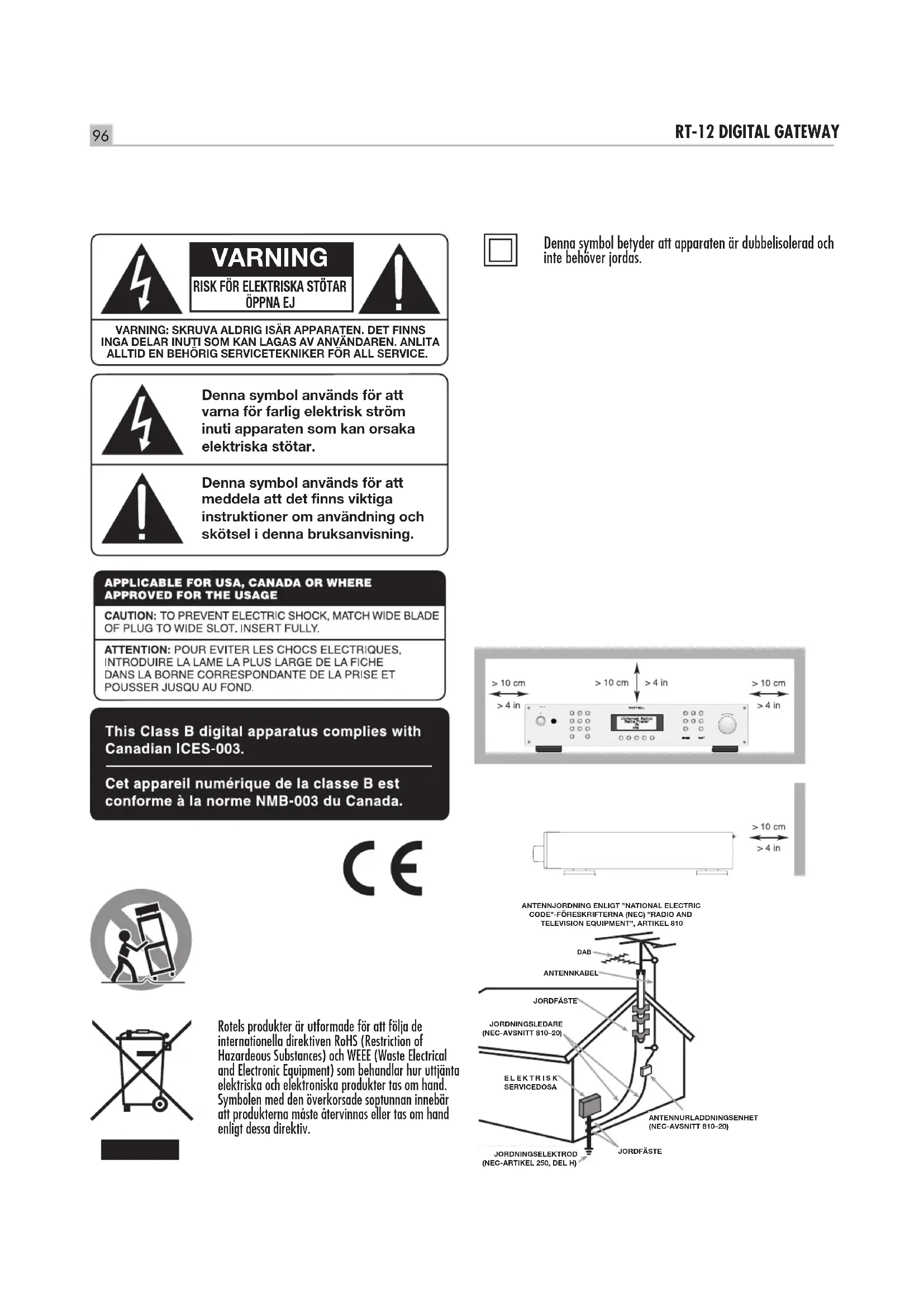 ANTENNKABEL JORDFÄSTE JORDFÄSTE ANTENNURLADDNINGSENHET (NEC-AVSNITT 810–20) JORDNINGSLEDARE (NEC-AVSNITT 810–20) JORDNINGSELEKTROD (NEC-ARTIKEL 250, DEL H) E L E K T R I S K SERVICEDOSA97 Svenska Viktig säkerhetsinformation VARNING! Försök aldrig att själv utföra service på apparaten. Anlita alltid en behörig servicetekniker för all service. VARNING! För att undvika risk för elektriska stötar och brand, utsätt inte apparaten för vatten eller fukt. Ställ aldrig föremål som kan läcka eller droppa vatten, till exempel blomkrukor, i närheten av apparaten. Se till att inga föremål kommer in i apparaten. Om apparaten utsätts för fukt, väta eller om främmande föremål kommer in i den, dra omedelbart ut nätkabeln ur vägguttaget. Lämna sedan apparaten till en behörig servicetekniker för översyn och eventuell reparation. Läs alla instruktioner innan du ansluter eller använder apparaten. Behåll denna bruksanvisning så att du kan studera dessa säkerhetsföreskrifter. Följ alla varningar och säkerhetsföreskrifter i bruksanvisningen och på själva apparaten. Följ alltid alla användarinstruktioner. Använd bara en torr trasa eller dammsugaren när du rengör apparaten. Använd inte denna enhet nära vatten. Se till att det alltid finns 10 cm fritt utrymme runt apparaten. Ställ inte apparaten på en säng, soffa, matta eller någon liknande yta som kan blockera ventilationshålen. Om apparaten placeras i en bokhylla eller i ett skåp måste det finnas utrymme för god ventilation. Placera inte apparaten nära element eller andra apparater som utvecklar värme. VARNING: Strömuttaget på apparatens baksida fungerar som huvudströmbrytare. Apparaten måste placeras så att strömuttaget alltid är åtkomligt. Apparaten måste vara ansluten till ett vägguttag enligt markeringen på apparatens baksida (Europa 230 V/50 Hz, USA 120 V/60 Hz). Anslut endast apparaten till vägguttaget med den medföljande strömkabeln eller en exakt motsvarighet. Modifiera inte den medföljande strömkabeln på något sätt. Ändra inte jord eller polaritet. Använd inte någon förlängningskabel. Strömkabeln används som huvudströmbrytare. För att koppla från enheten helt och hållet måste kabeln lossas från strömuttaget. Standby-lysdioden lyser inte när strömkabeln inte är inkopplad. Strömkabeln används som huvudströmbrytare och måste finnas åtkomlig. Placera inte strömkabeln så att den kan bli utsatt för åverkan, extrem värme eller skadas på annat sätt. Var särskilt noga med att inte skada kabelns ändar. Strömkabeln ska kopplas ur vägguttaget vid åskväder eller om apparaten inte ska användas under en längre tid. Använd bara tillbehör som rekommenderas av tillverkaren. Använd bara stativ, rack, hyllor eller hyllsystem som rekommenderas av Rotel. Var försiktig när apparaten ska flyttas så att den inte välter. Sluta omedelbart använda apparaten och låt en behörig servicetekniker kontrollera den om:
