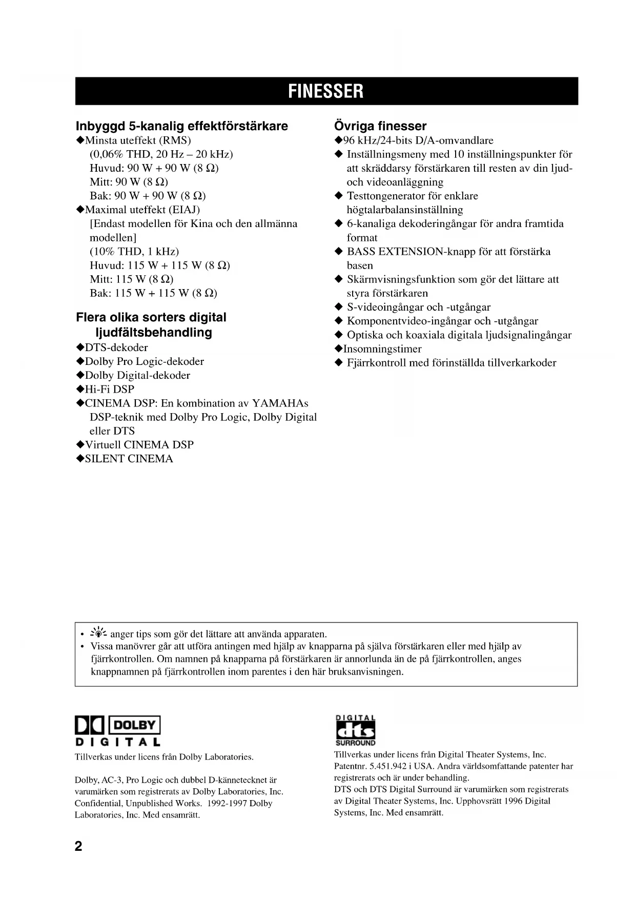 - REGISTER 0402AX620(GB)_1-10_SW 1/24/1, 11:56 AM12 Inbyggd 5-kanalig effektförstärkare ◆ Minsta uteffekt (RMS) (0,06% THD, 20 Hz – 20 kHz) Huvud: 90 W + 90 W (8 Ω) Mitt: 90 W (8 Ω) Bak: 90 W + 90 W (8 Ω) ◆ Maximal uteffekt (EIAJ) [Endast modellen för Kina och den allmänna modellen] (10% THD, 1 kHz) Huvud: 115 W + 115 W (8 Ω) Mitt: 115 W (8 Ω) Bak: 115 W + 115 W (8 Ω) Flera olika sorters digital ljudfältsbehandling ◆ DTS-dekoder ◆ Dolby Pro Logic-dekoder ◆ Dolby Digital-dekoder ◆ Hi-Fi DSP ◆ CINEMA DSP: En kombination av YAMAHAs DSP-teknik med Dolby Pro Logic, Dolby Digital eller DTS ◆ Virtuell CINEMA DSP ◆ SILENT CINEMA Övriga finesser ◆ 96 kHz/24-bits D/A-omvandlare ◆ Inställningsmeny med 10 inställningspunkter för att skräddarsy förstärkaren till resten av din ljud- och videoanläggning ◆ Testtongenerator för enklare högtalarbalansinställning ◆ 6-kanaliga dekoderingångar för andra framtida format ◆ BASS EXTENSION-knapp för att förstärka basen ◆ Skärmvisningsfunktion som gör det lättare att styra förstärkaren ◆ S-videoingångar och -utgångar ◆ Komponentvideo-ingångar och -utgångar ◆ Optiska och koaxiala digitala ljudsignalingångar ◆ Insomningstimer ◆ Fjärrkontroll med förinställda tillverkarkoder FINESSER p. 62