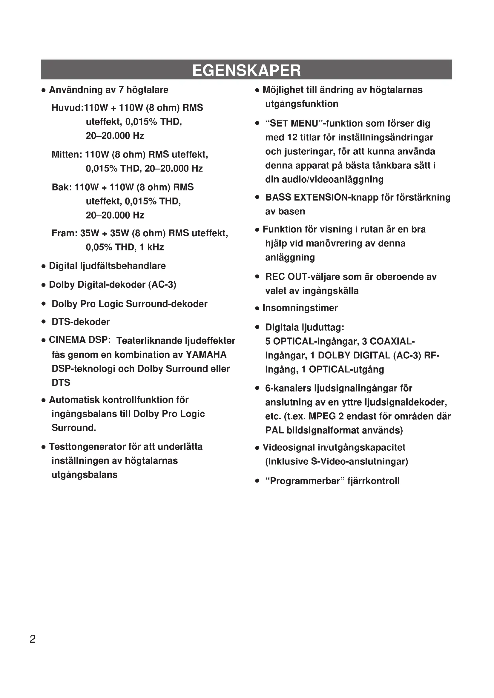 Denna apparat innehåller en sofistikerad digital ljudfältsprocessor med många program. Processorn ger dig möjlighet att bredda och ändra formen på ljudfältet från både audio- och videokällor för att ge en teaterliknande erfarenhet i ditt lyssningsrum. Denna apparat har totalt 12 olika digitala funktioner för ljudfältsprocessor (DSP). Du kan skapa ett utsökt ljudfält genom att välja ett passande ljudfält (det beror förstås på vad du skall lyssna på) och lägga till önskade justeringar. Dessutom innehåller denna apparat en Dolby Pro Logic Surround-dekoder och en Dolby Digital-dekoder (AC-3) för flerkanals ljudåtergivning från Dolby Surround-bearbetade videokällor, samt en DTS-dekoder för flerkanalig ljudåtergivning av DTS-inkodade audio- och videokällor. Användningen av Dolby Pro Logic Surround, Dolby Digital (AC-3) eller DTS-dekodern kan styras genom att välja ett motsvarande DSP-program, inklusive kombinerad användning av DSP och Dolby Pro Logic Surround, DSP och Dolby Digital (AC-3) eller DSP och DTS. Denna enhet är också utrustad med en inbyggd balanskontroll för ingångsljud. Detta försäkrar dig bästa möjliga återgivning utan att behöva ställa in manuellt. Digital ljudbehandling Vad är det som gör levande musik så attraktiv? Dagens apparater som återger ljudinspelningar kommer mycket nära ljudet som det låter i verkligheten, men många tycker fortfarande att det är någonting som fattas: oftast rör det sig då om akustiken som den upplevs i en konsertsal, på scen, e.dyl. Yamahas ljudingenjörer har länge forskat inom området ljudreflexer för att teoretiskt bestämma hur ambiensen i olika lokaler påverkar musiken. De samlade resultaten från denna forskning ligger bakom DSP-konceptet och det levande ljud, som apparaten är kapabel att återge. Yamaha-ingenjörerna har dessutom utfört mätningar på ett otal platser och har lyckats att via DSP-processorn exakt återge akustiken som existerar i kända konsertsalar, jazzklubbar, teatrar, osv. Du kan således hemma i ditt vardagsrum sitta och njuta av musik såsom den är menad att låta på en av dessa kända scener. Dolby Pro Logic Surround Denna apparat har en Dolby Pro Logic Surround-dekoder som liknar de professionella Dolby Stereo-dekoders som används i många biosalonger. Genom att använda Dolby Pro Logic Surround-dekodern kan du uppleva en fantastisk realism och spännande ljudeffekter med Dolby stereo biosalongljud i ditt eget hem. Dolby Pro Logic har ett system för fyra kanaler och fem högtalare. Pro Logic Surround-systemet delar upp den inkommande signalen i fyra delar: vänster och höger huvudkanaler, mittkanalen (används för tal) samt den bakre surroundljudskanalen (som används för ljudeffekter, bakgrundsljud och andra kringliggande ljud.) Tack vare mittkanalen, som används för tal, kan lyssnare som inte sitter exakt i centrum ändå höra talet från händelserna på skärmen med stereoeffekt från de andra kanalerna. Dolby Surround finns inkodat på en mängd ljudspår för förinspelade videoband, laserskivor samt vissa TV/kabel-TV- sändningar. När du spelar en programkälla som har inkodats med Dolby Surround via denna apparat, avkodar Dolby Pro Logic Surround-dekodern signalen och matar ut surroundljudseffekterna. Dolby Digital (AC-3) Dolby Digital (AC-3) är en ny generation av Surround- ljudsystem, som är ett rumsligt ljudbearbetningsformat som har utvecklats för 35 mm filmer, genom att använda ljudkodning med lågt bit-tal. Dolby Digital (AC-3) är ett digitalt surroundljudssystem som ger totalt oberoende flerkanalsljud åt lyssnaren. I flerkanalsform ger Dolby Digital (AC-3) fem fullomfångskanaler i vad som ibland kallas “3/2”-konfiguration: tre främre kanaler (vänster, mitten och höger) plus två surroundkanaler. En sjätte kanal endast för basljudeffekter finns också för utmatning av LFE (lågfrekvenseffekt), eller lågbaseffekter, som är helt separat från de övriga kanalerna. (Denna kallas för “subwoofer- kanalen” eller “LFE-kanalen”.) Denna kanal räknas som 0,1, vilket leder till den nya termen 5,1 kanaler totalt. Jämfört med Dolby Pro Logic som kallas för ett “3/1”-system (vänster fram, mitten och höger fram samt endast en surroundkanal), har Dolby Digital (AC-3) två surroundkanaler, kallade stereo eller delade surroundkanaler, var och en med samma fullomfångsljud som de tre främre kanalerna. Genom att använda den inbyggda Dolby Digital-dekodern (AC- 3), kan du uppleva den dramatiska realismen och effekten för Dolby Digital stereo biosalongljud hemma i din egen bostad. Ljud med ett brett dynamikomfång utmatat av de fem fullomfångskanalerna ger lyssnaren en begeistring som aldrig har upplevts tidigare. Den exakta ljudorienteringen med den diskreta digitala ljudbearbetningen breddar den realism som originalfilmen har.DTS-systemet (Digital Theater Systems) utvecklades för att ersätta analoga ljudspår för filmer med sex diskreta kanaler för digitala ljudspår. I dag har detta system installerats i många biosalonger över hela världen. DTS digitala avspelningssystem har ändrat det sätt, på vilket vi upplevde filmer i biosalonger med sex diskreta kanaler för utsökt digitalljud. På grund av intensiv forskning och utveckling kring DTS- teknologin, har det blivit möjligt att utnyttja en liknande diskret- teknologi för inkodning/avkodning för surroundljudsunderhållning hemma i bostaden. DTS Digital Surround är ett system för inkodning/avkodning som matar sex kanaler 20-bits ljud med synnerligen hög kvalitet; det är tekniskt sett 5,1 kanaler, vilket betyder fem fullomfångskanaler (vänster, mitten, höger och två surround) samt en kanal för subwoofer (LFE) (kallad “0,1”). Systemet är kompatibelt med de 5,1-högtalarsystem som i dag finns tillgängliga för hemmabiosystem. DTS Digital Surround-algoritmen har utformats för inkodning med avsevärt mindre datakomprimering av de sex kanal