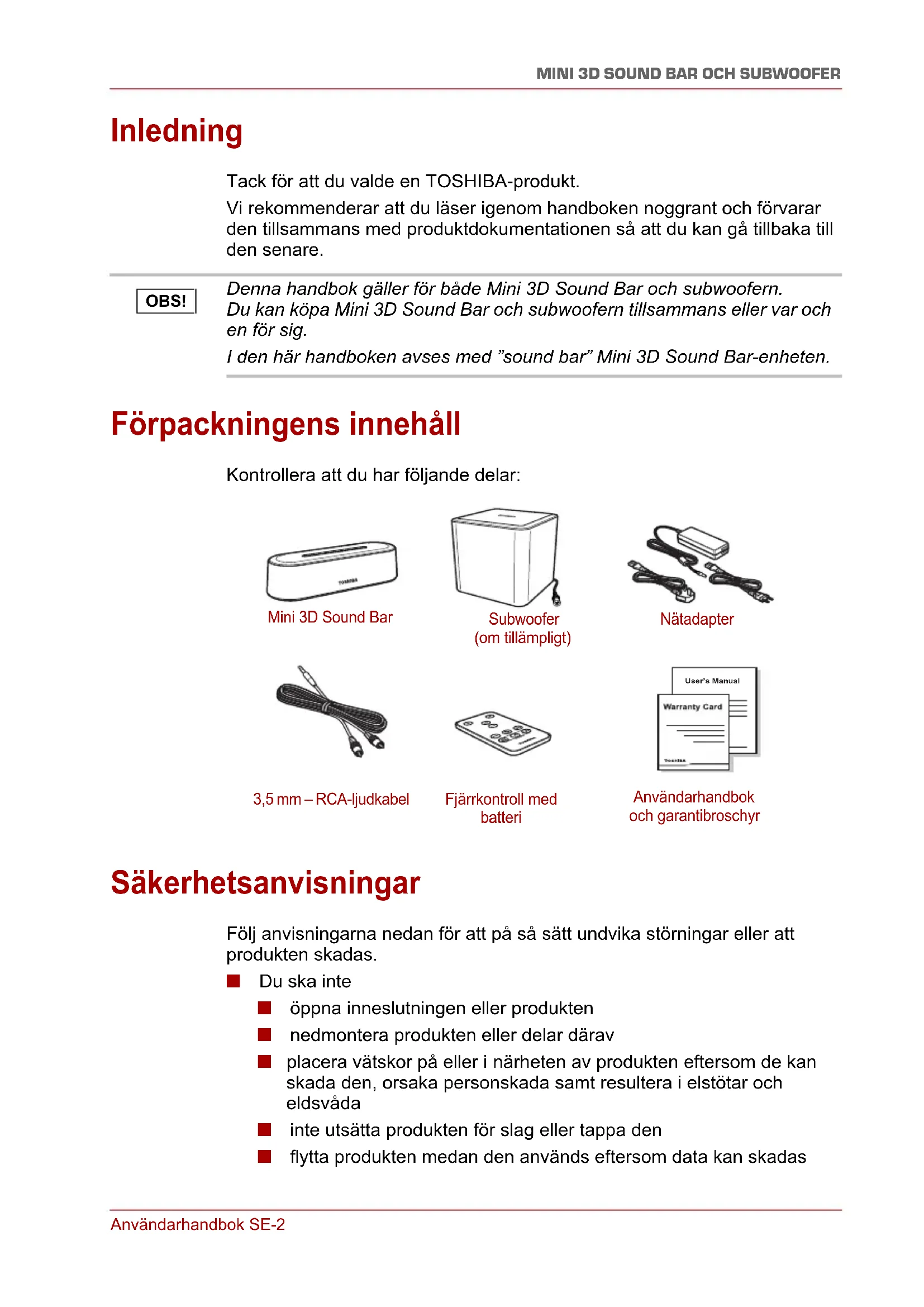 Inledning Tack för att du valde en TOSHIBA-produkt. Vi rekommenderar att du läser igenom handboken noggrant och förvarar den tillsammans med produktdokumentationen så att du kan gå tillbaka till den senare. Förpackningens innehåll Kontrollera att du har följande delar: Säkerhetsanvisningar Följ anvisningarna nedan för att på så sätt undvika störningar eller att produkten skadas. ■ Du ska inte ■ öppna inneslutningen eller produkten ■ nedmontera produkten eller delar därav ■ placera vätskor på eller i närheten av produkten eftersom de kan skada den, orsaka personskada samt resultera i elstötar och eldsvåda ■ inte utsätta produkten för slag eller tappa den ■ flytta produkten medan den används eftersom data kan skadas Denna handbok gäller för både Mini 3D Sound Bar och subwoofern. Du kan köpa Mini 3D Sound Bar och subwoofern tillsammans eller var och en för sig. I den här handboken avses med ”sound bar” Mini 3D Sound Bar-enheten. OBS! User’s Manual Mini 3D Sound Bar Subwoofer (om tillämpligt) Nätadapter 3,5 mm – RCA-ljudkabel Fjärrkontroll med batteri Användarhandbok och garantibroschyrSE-3 Användarhandbok
