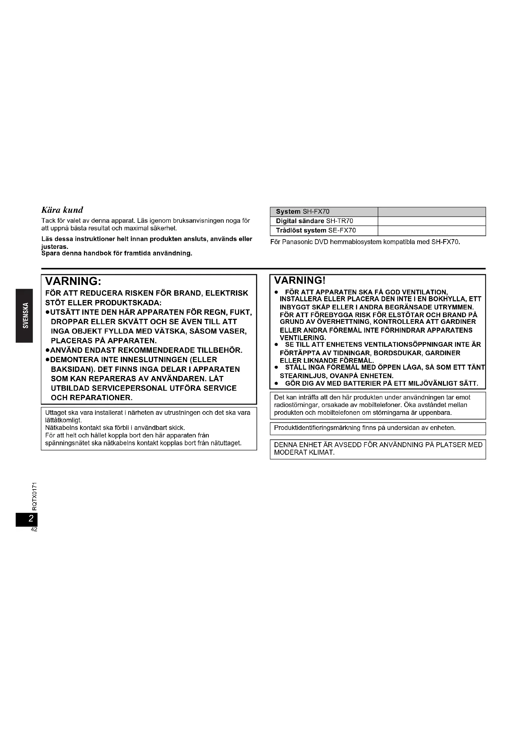 RQTX0171 SVENSKA Kära kund Tack för valet av denna apparat. Läs igenom bruksanvisningen noga för att uppnå bästa resultat och maximal säkerhet.Läs dessa instruktioner helt innan produkten ansluts, används eller justeras.Spara denna handbok för framtida användning.För Panasonic DVD hemmabiosystem kompatibla med SH-FX70.System SH-FX70Digital sändare SH-TR70Trådlöst system SE-FX70 VARNING: FÖR ATT REDUCERA RISKEN FÖR BRAND, ELEKTRISK STÖT ELLER PRODUKTSKADA: ≥UTSÄTT INTE DEN HÄR APPARATEN FÖR REGN, FUKT, DROPPAR ELLER SKVÄTT OCH SE ÄVEN TILL ATT INGA OBJEKT FYLLDA MED VÄTSKA, SÅSOM VASER, PLACERAS PÅ APPARATEN. ≥ANVÄND ENDAST REKOMMENDERADE TILLBEHÖR.