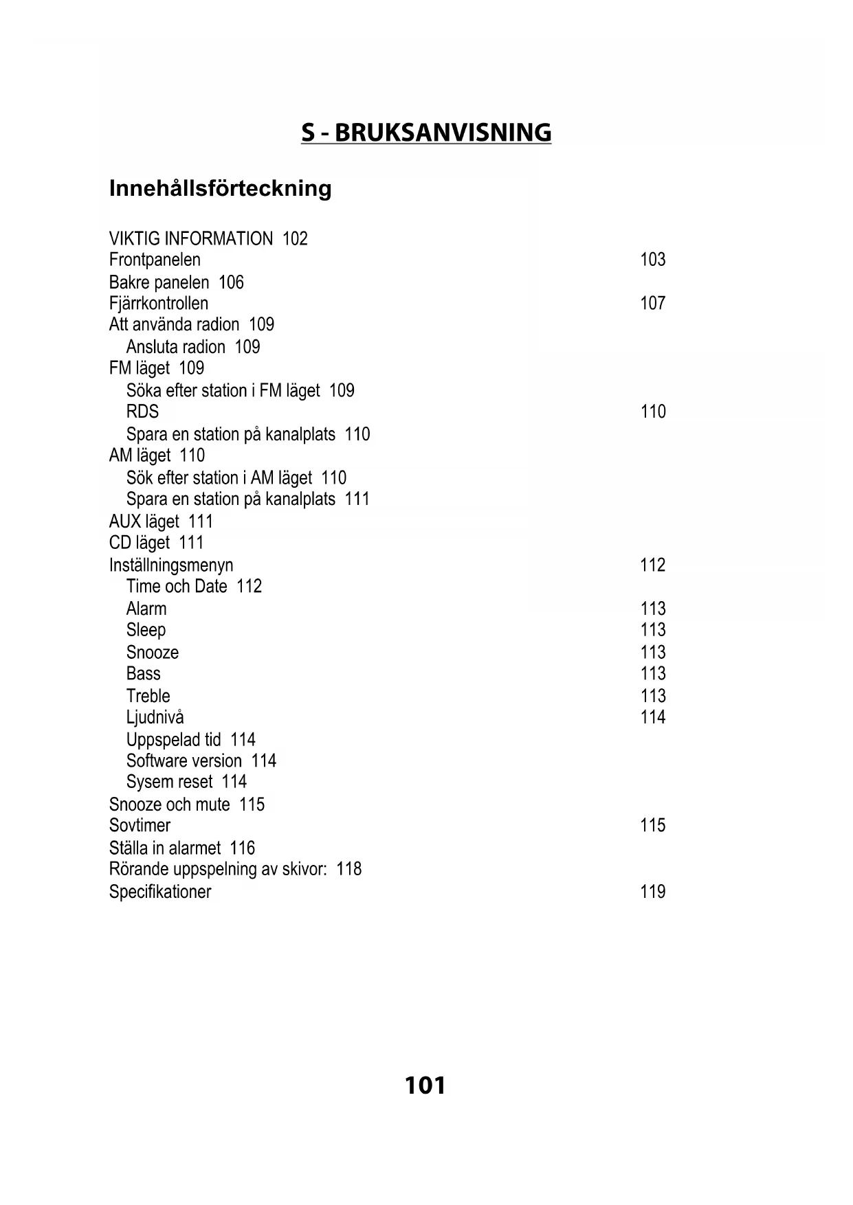 Innehållsförteckning VIKTIG INFORMATION 102 Frontpanelen 103 Bakre panelen 106 Fjärrkontrollen 107 Att använda radion 109 Ansluta radion 109 FM läget 109 Söka efter station i FM läget 109 RDS 110 Spara en station på kanalplats 110 AM läget 110 Sök efter station i AM läget 110 Spara en station på kanalplats 111 AUX läget 111 CD läget 111 Inställningsmenyn 112 Time och Date 112 Alarm 113 Sleep 113 Snooze 113 Bass 113 Treble 113 Ljudnivå 114 Uppspelad tid 114 Software version 114 Sysem reset 114 Snooze och mute 115 Sovtimer 115 Ställa in alarmet 116 Rörande uppspelning av skivor: 118 Specifikationer 119102 VIKTIG INFORMATION Lycka till med Din nya radio. Läs noggrant igenom denna instruktion för att undvika felaktig funktion och skador på radion. Detta hjälper Dig att få glädje av Din radio under mycket lång tid.