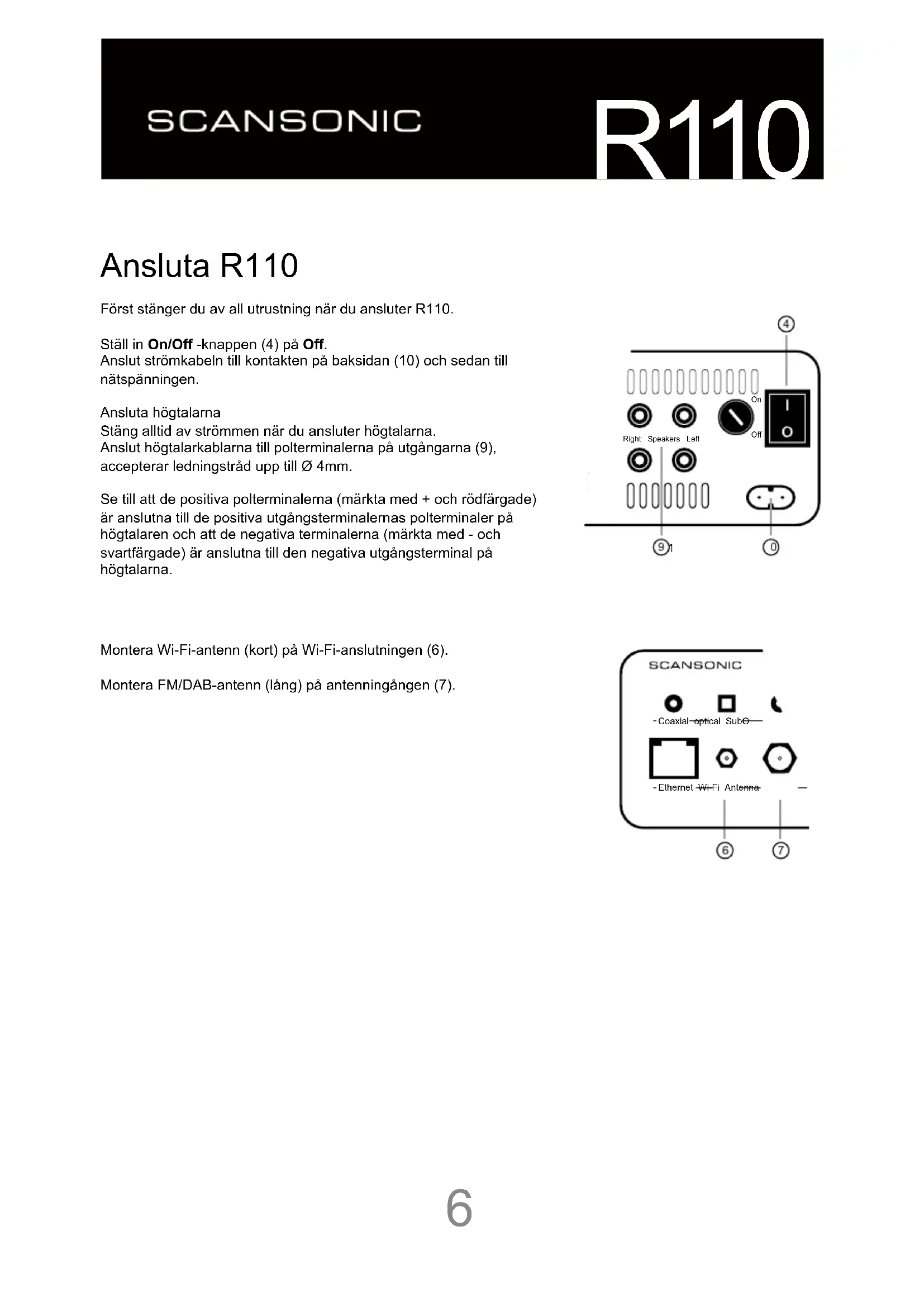Off Ansluta R110 Först stänger du av all utrustning när du ansluter R110. Ställ in On/Off -knappen (4) på Off. Anslut strömkabeln till kontakten på baksidan (10) och sedan till nätspänningen. Ansluta högtalarna Stäng alltid av strömmen när du ansluter högtalarna. Anslut högtalarkablarna till polterminalerna på utgångarna (9), accepterar ledningstråd upp till Ø 4mm. Se till att de positiva polterminalerna (märkta med + och rödfärgade) är anslutna till de positiva utgångsterminalernas polterminaler på högtalaren och att de negativa terminalerna (märkta med - och svartfärgade) är anslutna till den negativa utgångsterminal på högtalarna. Montera Wi-Fi-antenn (kort) på Wi-Fi-anslutningen (6). Montera FM/DAB-antenn (lång) på antenningången (7).R110