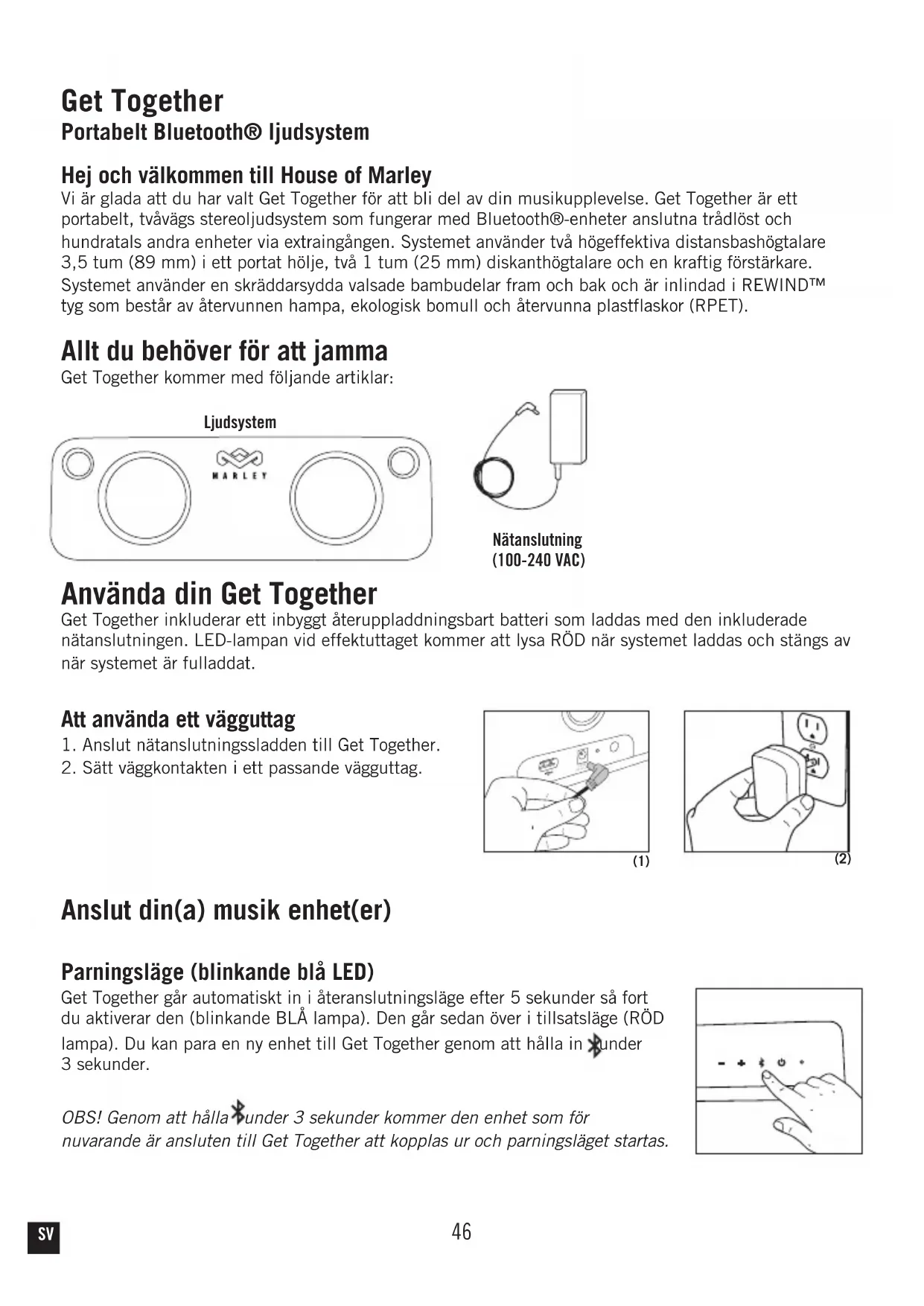 Tama symboli tarkoittaa, etta akkuja ei saa havittaa talousjatteiden mukana, koska ne sisaltavat aineita, jotka voivat olla vahingollisia ymparistolle ja terveydelle. Vie akut niille tarkoitettuihin kerayspisteisiin. FI46 Get Together Portabelt Bluetooth® ljudsystem Hej och välkommen till House of Marley Vi är glada att du har valt Get Together för att bli del av din musikupplevelse. Get Together är ett portabelt, tvåvägs stereoljudsystem som fungerar med Bluetooth®-enheter anslutna trådlöst och hundratals andra enheter via extraingången. Systemet använder två högeffektiva distansbashögtalare 3,5 tum (89 mm) i ett portat hölje, två 1 tum (25 mm) diskanthögtalare och en kraftig förstärkare. Systemet använder en skräddarsydda valsade bambudelar fram och bak och är inlindad i REWIND™ tyg som består av återvunnen hampa, ekologisk bomull och återvunna plastflaskor (RPET). Allt du behöver för att jamma Get Together kommer med följande artiklar: Ljudsystem Nätanslutning (100-240 VAC) Använda din Get Together Get Together inkluderar ett inbyggt återuppladdningsbart batteri som laddas med den inkluderade nätanslutningen. LED-lampan vid effektuttaget kommer att lysa RÖD när systemet laddas och stängs av när systemet är fulladdat. Att använda ett vägguttag