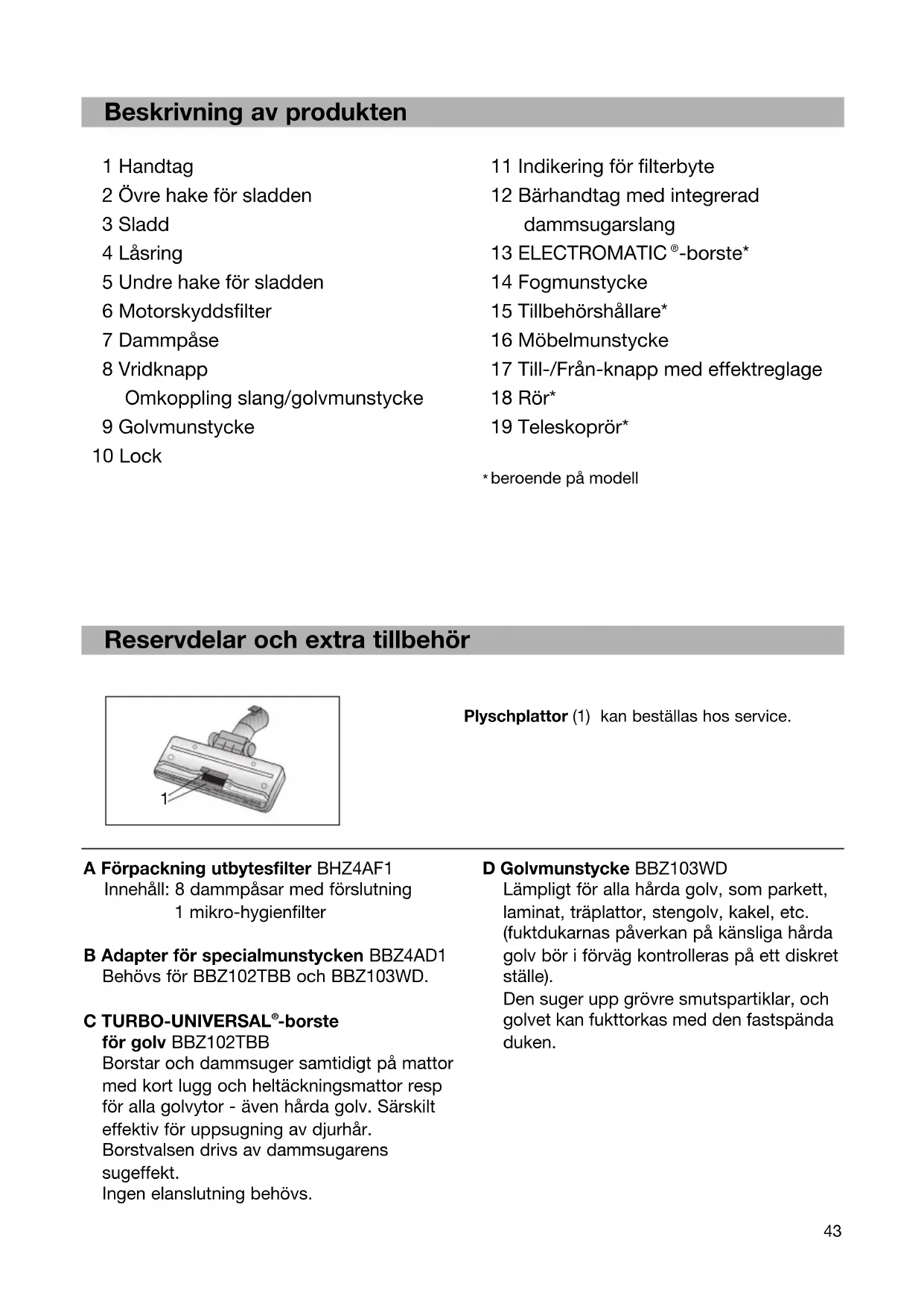 -borste för golv BBZ102TBB Borstar och dammsuger samtidigt på mattor med kort lugg och heltäckningsmattor resp för alla golvytor - även hårda golv. Särskilt effektiv för uppsugning av djurhår. Borstvalsen drivs av dammsugarens sugeffekt. Ingen elanslutning behövs. Plyschplattor (1) kan beställas hos service. D Golvmunstycke BBZ103WD Lämpligt för alla hårda golv, som parkett, laminat, träplattor, stengolv, kakel, etc. (fuktdukarnas påverkan på känsliga hårda golv bör i förväg kontrolleras på ett diskret ställe). Den suger upp grövre smutspartiklar, och golvet kan fukttorkas med den fastspända duken.