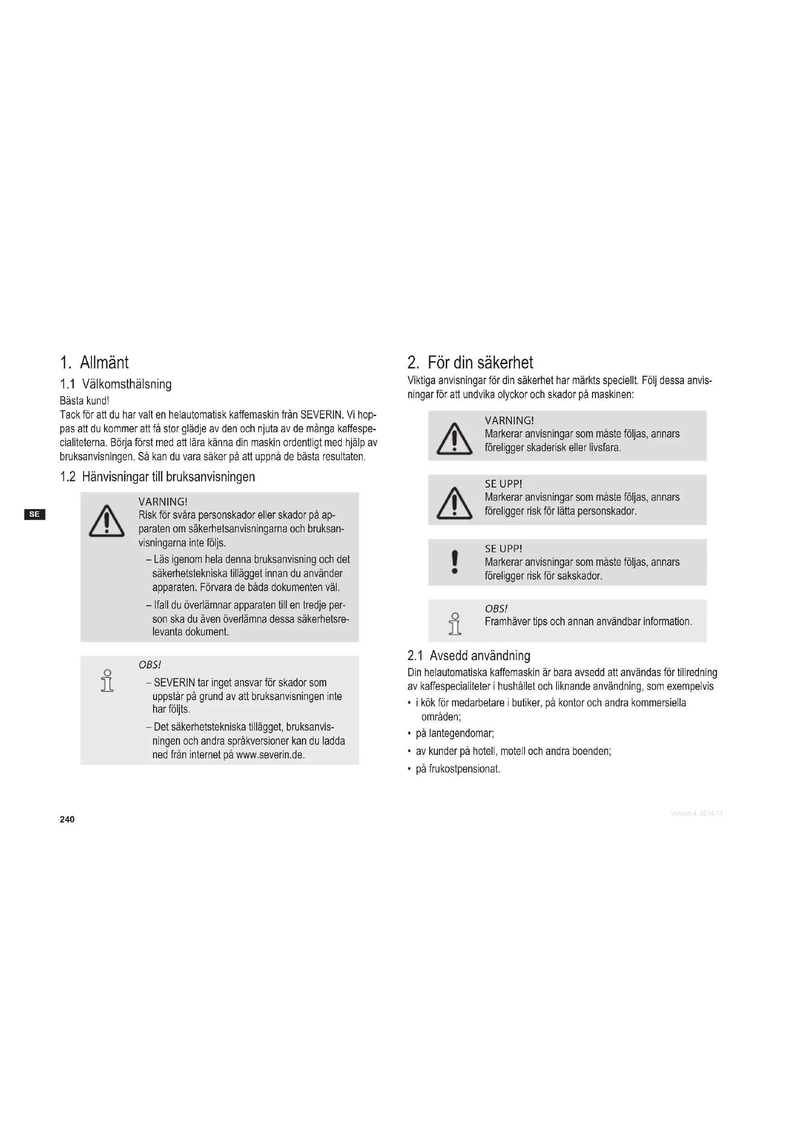 Bästa kund! Tack för att du har valt en helautomatisk kaffemaskin från SEVERIN. Vi hop- pas att du kommer att få stor glädje av den och njuta av de många kaffespe- cialiteterna. Börja först med att lära känna din maskin ordentligt med hjälp av bruksanvisningen. Så kan du vara säker på att uppnå de bästa resultaten.