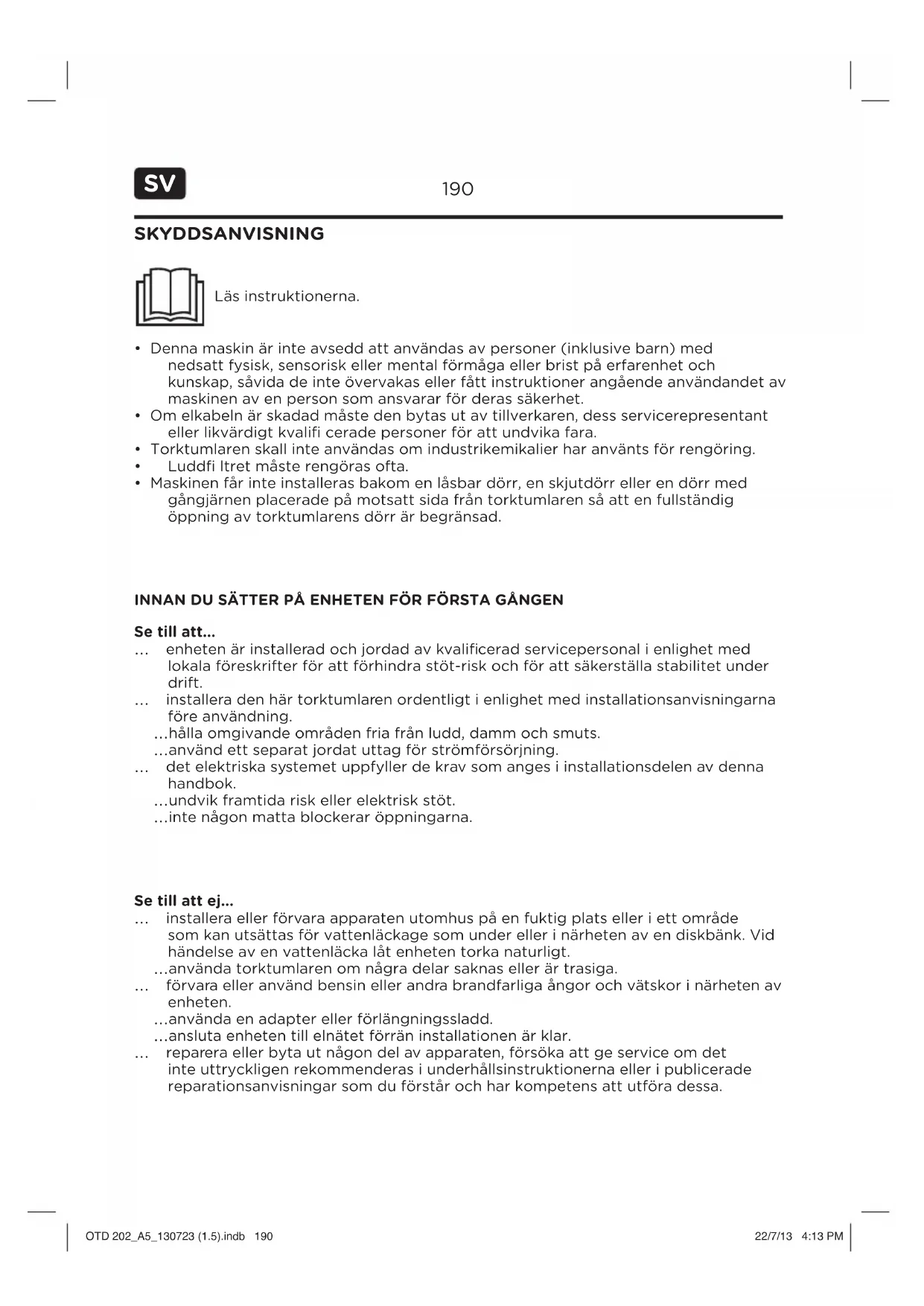 Observera! Denna torktumlare ar endast for privat bruk. Använd den inte für andereändamål an de für vilka den ar avseddd. Folj anvisingarna på etiketten på varje plagg och torka endast maskin-tvättbara plagg.