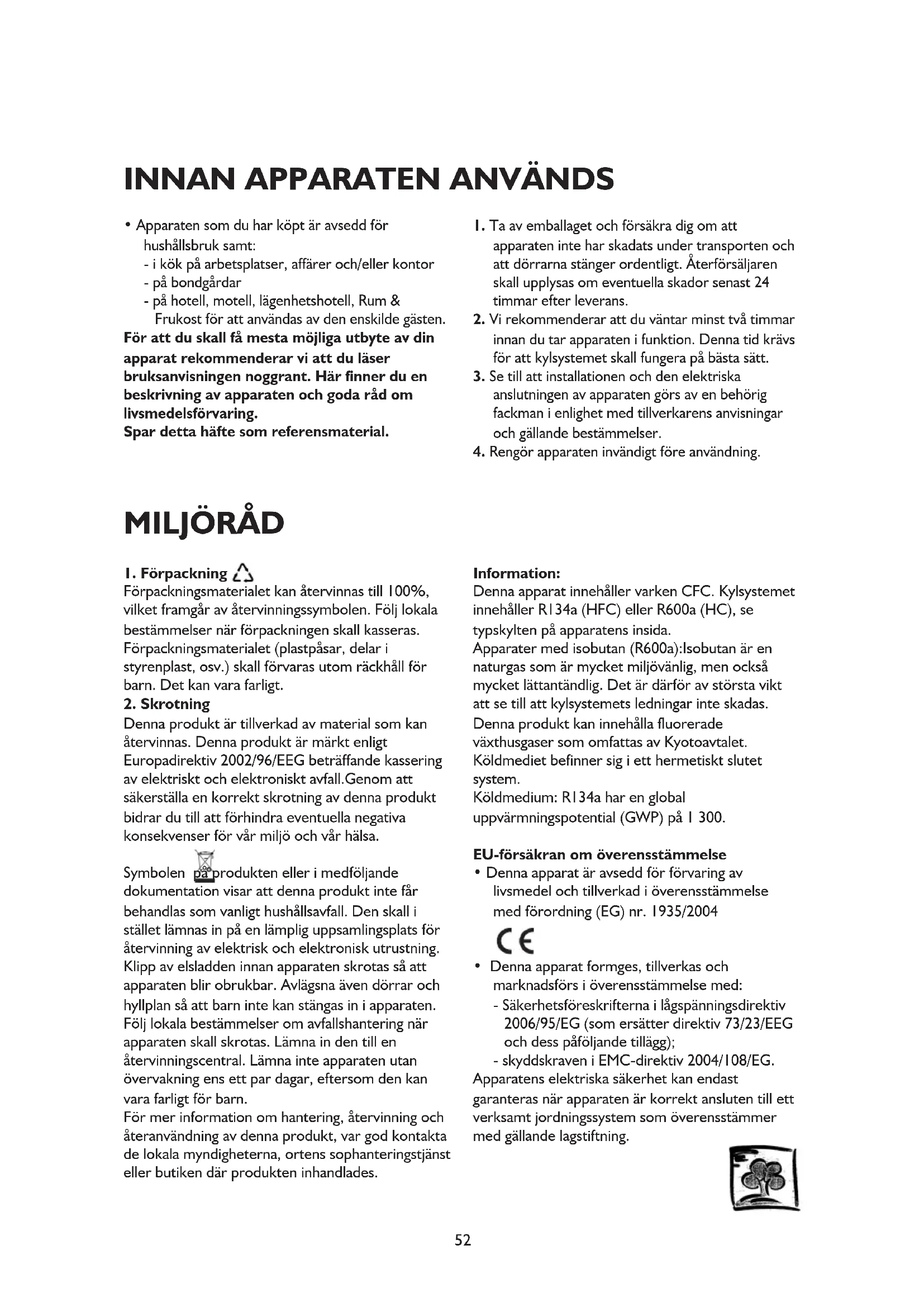 Denna produkt är tillverkad av material som kan återvinnas. Denna produkt är märkt enligt Europadirektiv 2002/96/EEG beträffande kassering av elektriskt och elektroniskt avfall.Genom att säkerställa en korrekt skrotning av denna produkt bidrar du till att förhindra eventuella negativa konsekvenser för vår miljö och vår hälsa. Symbolen på produkten eller i medföljande dokumentation visar att denna produkt inte får behandlas som vanligt hushållsavfall. Den skall i stället lämnas in på en lämplig uppsamlingsplats för återvinning av elektrisk och elektronisk utrustning. Klipp av elsladden innan apparaten skrotas så att apparaten blir obrukbar. Avlägsna även dörrar och hyllplan så att barn inte kan stängas in i apparaten. Följ lokala bestämmelser om avfallshantering när apparaten skall skrotas. Lämna in den till en återvinningscentral. Lämna inte apparaten utan övervakning ens ett par dagar, eftersom den kan vara farligt för barn. För mer information om hantering, återvinning och återanvändning av denna produkt, var god kontakta de lokala myndigheterna, ortens sophanteringstjänst eller butiken där produkten inhandlades. Information: Denna apparat innehåller varken CFC. Kylsystemet innehåller R134a (HFC) eller R600a (HC), se typskylten på apparatens insida. Apparater med isobutan (R600a):Isobutan är en naturgas som är mycket miljövänlig, men också mycket lättantändlig. Det är därför av största vikt att se till att kylsystemets ledningar inte skadas. Denna produkt kan innehålla fluorerade växthusgaser som omfattas av Kyotoavtalet. Köldmediet befinner sig i ett hermetiskt slutet system. Köldmedium: R134a har en global uppvärmningspotential (GWP) på 1 300. EU-försäkran om överensstämmelse
