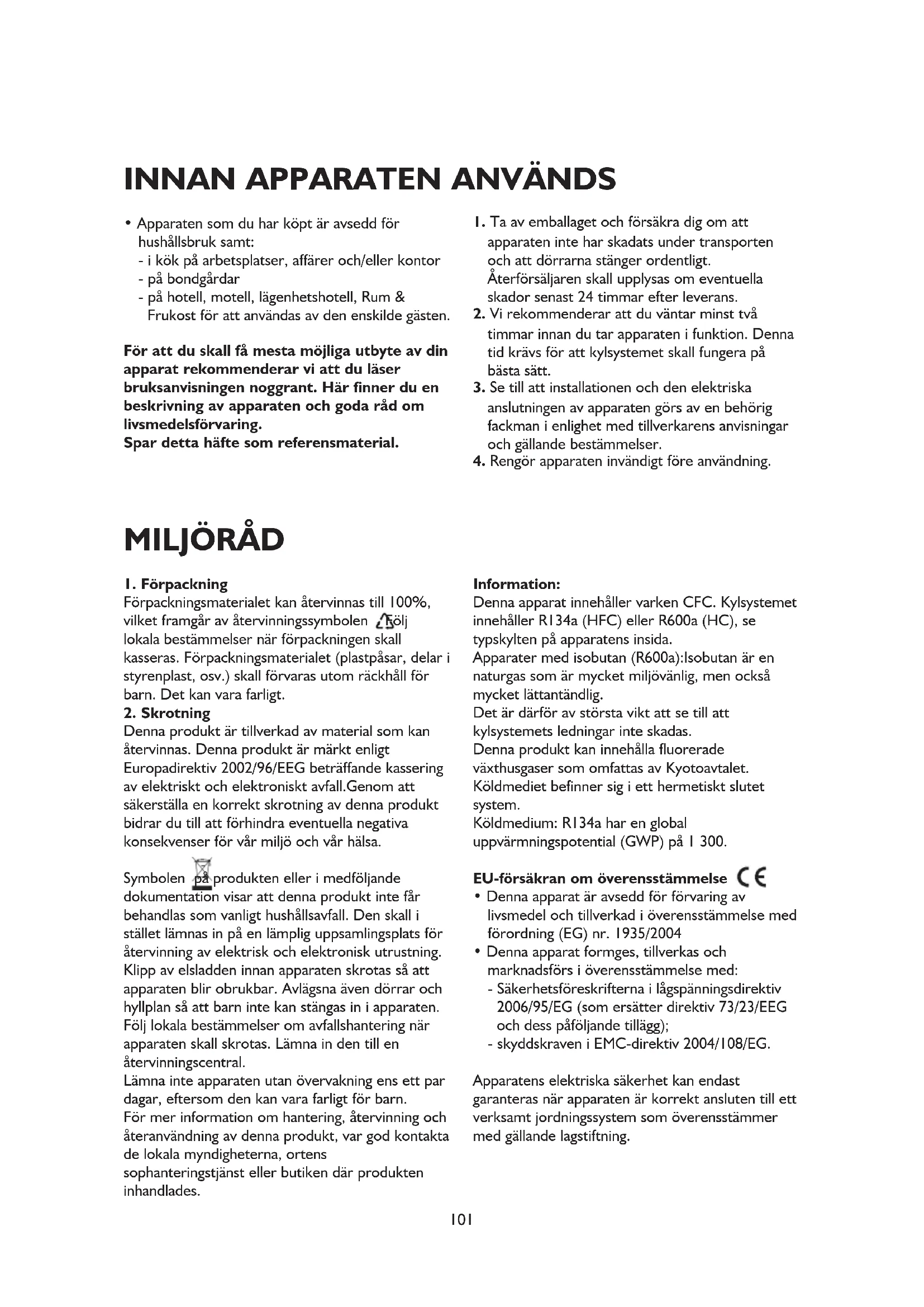 Denna produkt är tillverkad av material som kan återvinnas. Denna produkt är märkt enligt Europadirektiv 2002/96/EEG beträffande kassering av elektriskt och elektroniskt avfall.Genom att säkerställa en korrekt skrotning av denna produkt bidrar du till att förhindra eventuella negativa konsekvenser för vår miljö och vår hälsa. Symbolen på produkten eller i medföljande dokumentation visar att denna produkt inte får behandlas som vanligt hushållsavfall. Den skall i stället lämnas in på en lämplig uppsamlingsplats för återvinning av elektrisk och elektronisk utrustning. Klipp av elsladden innan apparaten skrotas så att apparaten blir obrukbar. Avlägsna även dörrar och hyllplan så att barn inte kan stängas in i apparaten. Följ lokala bestämmelser om avfallshantering när apparaten skall skrotas. Lämna in den till en återvinningscentral. Lämna inte apparaten utan övervakning ens ett par dagar, eftersom den kan vara farligt för barn. För mer information om hantering, återvinning och återanvändning av denna produkt, var god kontakta de lokala myndigheterna, ortens sophanteringstjänst eller butiken där produkten inhandlades. Information: Denna apparat innehåller varken CFC. Kylsystemet innehåller R134a (HFC) eller R600a (HC), se typskylten på apparatens insida. Apparater med isobutan (R600a):Isobutan är en naturgas som är mycket miljövänlig, men också mycket lättantändlig. Det är därför av största vikt att se till att kylsystemets ledningar inte skadas. Denna produkt kan innehålla fluorerade växthusgaser som omfattas av Kyotoavtalet. Köldmediet befinner sig i ett hermetiskt slutet system. Köldmedium: R134a har en global uppvärmningspotential (GWP) på 1 300. EU-försäkran om överensstämmelse