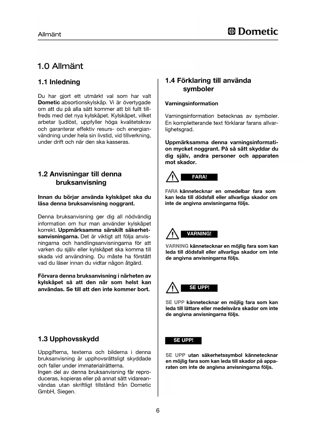 Allmänt Information INFORMATION ger dig kompletterande och användbar information om hur du ska använda ditt kylskåp. Miljöinformation Miljöinformation ger dig användbar informati- on om energisparning och kassering av appa- raten. Garantiåtaganden sköts enligt EU-riktlinje 44/1999/CE och enligt normala villkor för aktu- ellt land. I garantifall, kontakta handlaren. Eventuell skada orsakad av felaktig använd- ning täcks inte av garantin. Garantin täcker inte modifieringar av apparaten eller om man inte använder originalreservdelar från Dometic. Garantin gäller inte heller om instal- lations- och bruksanvisningen inte följs, och inget ansvar kan då utkrävas.