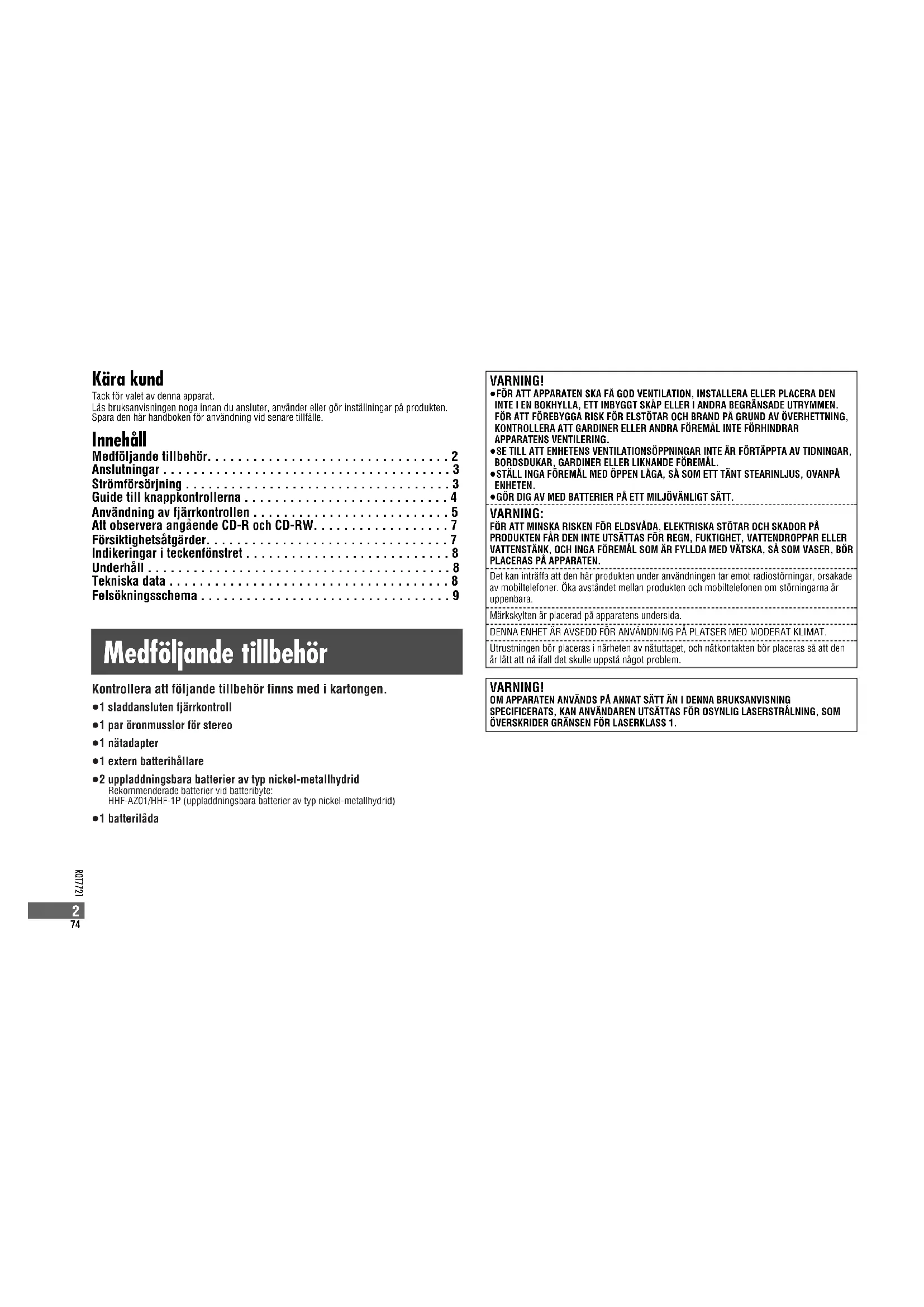 - RQT7721 VARNING! ≥FÖR ATT APPARATEN SKA FÅ GOD VENTILATION, INSTALLERA ELLER PLACERA DENINTE I EN BOKHYLLA, ETT INBYGGT SKÅP ELLER I ANDRA BEGRÄNSADE UTRYMMEN.FÖR ATT FÖREBYGGA RISK FÖR ELSTÖTAR OCH BRAND PÅ GRUND AV ÖVERHETTNING,KONTROLLERA ATT GARDINER ELLER ANDRA FÖREMÅL INTE FÖRHINDRARAPPARATENS VENTILERING.≥SE TILL ATT ENHETENS VENTILATIONSÖPPNINGAR INTE ÄR FÖRTÄPPTA AV TIDNINGAR,BORDSDUKAR, GARDINER ELLER LIKNANDE FÖREMÅL.≥STÄLL INGA FÖREMÅL MED ÖPPEN LÅGA, SÅ SOM ETT TÄNT STEARINLJUS, OVANPÅENHETEN.≥GÖR DIG AV MED BATTERIER PÅ ETT MILJÖVÄNLIGT SÄTT. VARNING: FÖR ATT MINSKA RISKEN FÖR ELDSVÅDA, ELEKTRISKA STÖTAR OCH SKADOR PÅ PRODUKTEN FÅR DEN INTE UTSÄTTAS FÖR REGN, FUKTIGHET, VATTENDROPPAR ELLERVATTENSTÄNK, OCH INGA FÖREMÅL SOM ÄR FYLLDA MED VÄTSKA, SÅ SOM VASER, BÖRPLACERAS PÅ APPARATEN.Det kan inträffa att den här produkten under användningen tar emot radiostörningar, orsakadeav mobiltelefoner. Öka avståndet mellan produkten och mobiltelefonen om störningarna äruppenbara.Märkskylten är placerad på apparatens undersida.DENNA ENHET ÄR AVSEDD FÖR ANVÄNDNING PÅ PLATSER MED MODERAT KLIMAT.Utrustningen bör placeras i närheten av nätuttaget, och nätkontakten bör placeras så att denär lätt att nå ifall det skulle uppstå något problem. Kära kund Tack för valet av denna apparat.Läs bruksanvisningen noga innan du ansluter, använder eller gör inställningar på produkten.Spara den här handboken för användning vid senare tillfälle. Innehåll Medföljande tillbehör p. 2
