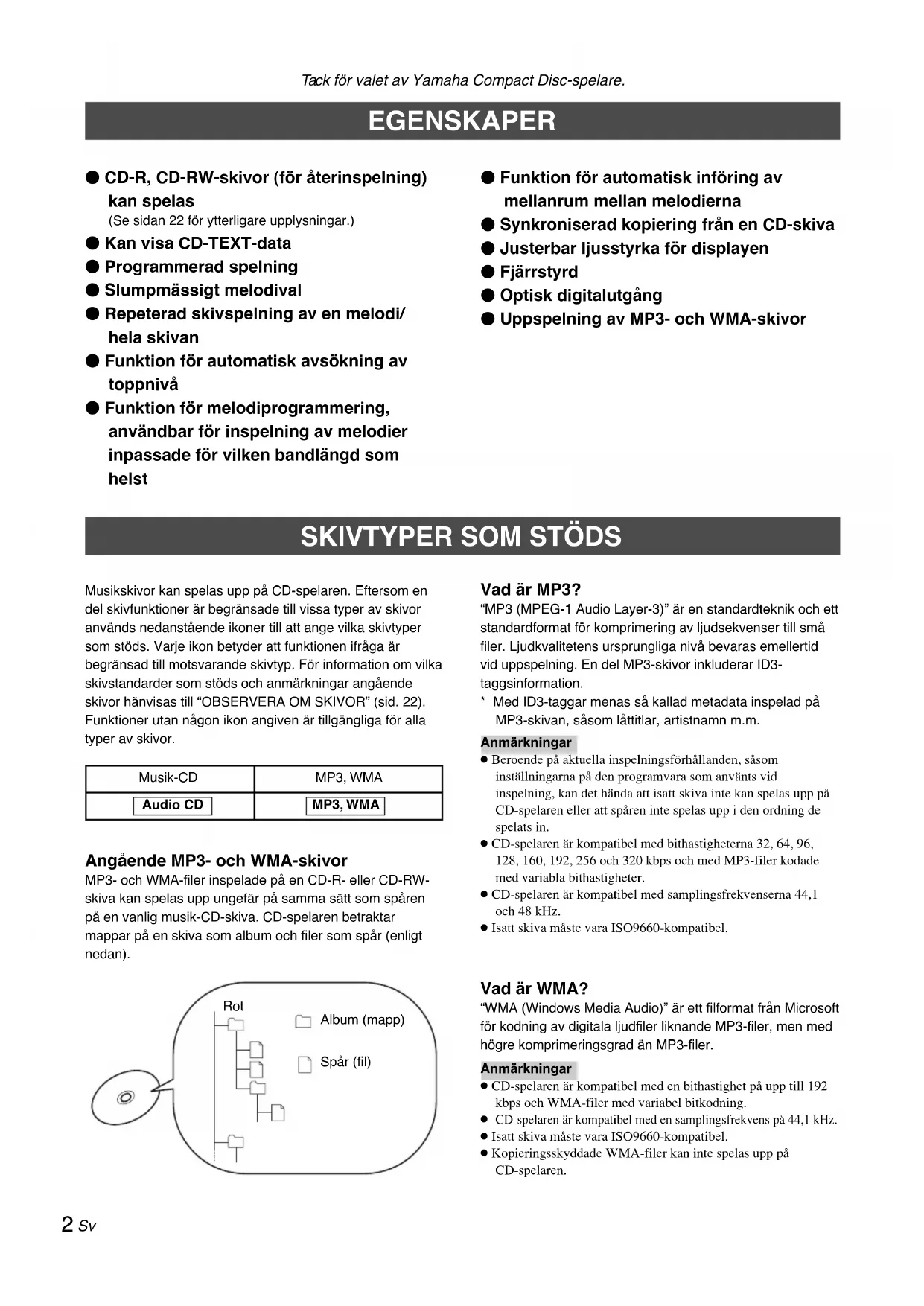 Musik-CD Angående MP3- och WMA-skivor MP3- och WMA-filer inspelade på en CD-R- eller CD-RW- skiva kan spelas upp ungefär på samma sätt som spåren på en vanlig musik-CD-skiva. CD-spelaren betraktar mappar på en skiva som album och filer som spår (enligt nedan). MP3, WMA Audio CD Tack för valet av Yamaha Compact Disc-spelare. EGENSKAPER MP3, WMA 䢇 CD-R, CD-RW-skivor (för återinspelning) kan spelas (Se sidan 22 för ytterligare upplysningar.) 䢇 Kan visa CD-TEXT-data 䢇 Programmerad spelning 䢇 Slumpmässigt melodival 䢇 Repeterad skivspelning av en melodi/ hela skivan 䢇 Funktion för automatisk avsökning av toppnivå 䢇 Funktion för melodiprogrammering, användbar för inspelning av melodier inpassade för vilken bandlängd som helst Rot Spår (fil) Album (mapp) 04Sw_02_BOD_CDX-397MK2_G.p65 29/1/07, 9:24 AM23