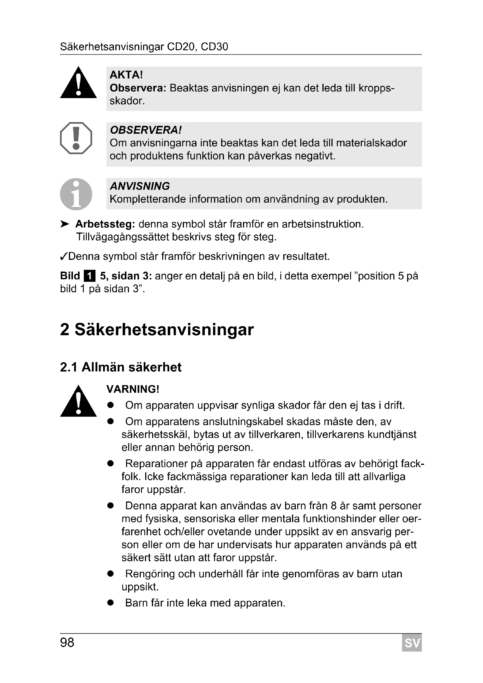 VARNING! Om apparaten uppvisar synliga skador får den ej tas i drift. Om apparatens anslutningskabel skadas måste den, av säkerhetsskäl, bytas ut av tillverkaren, tillverkarens kundtjänst eller annan behörig person. Reparationer på apparaten får endast utföras av behörigt fack- folk. Icke fackmässiga reparationer kan leda till att allvarliga faror uppstår. Denna apparat kan användas av barn från 8 år samt personer med fysiska, sensoriska eller mentala funktionshinder eller oer- farenhet och/eller ovetande under uppsikt av en ansvarig per- son eller om de har undervisats hur apparaten används på ett säkert sätt utan att faror uppstår. Rengöring och underhåll får inte genomföras av barn utan uppsikt. Barn får inte leka med apparaten. AKTA! Observera: Beaktas anvisningen ej kan det leda till kropps- skador. OBSERVERA! Om anvisningarna inte beaktas kan det leda till materialskador och produktens funktion kan påverkas negativt. ANVISNING Kompletterande information om användning av produkten.SV CD20, CD30 Säkerhetsanvisningar