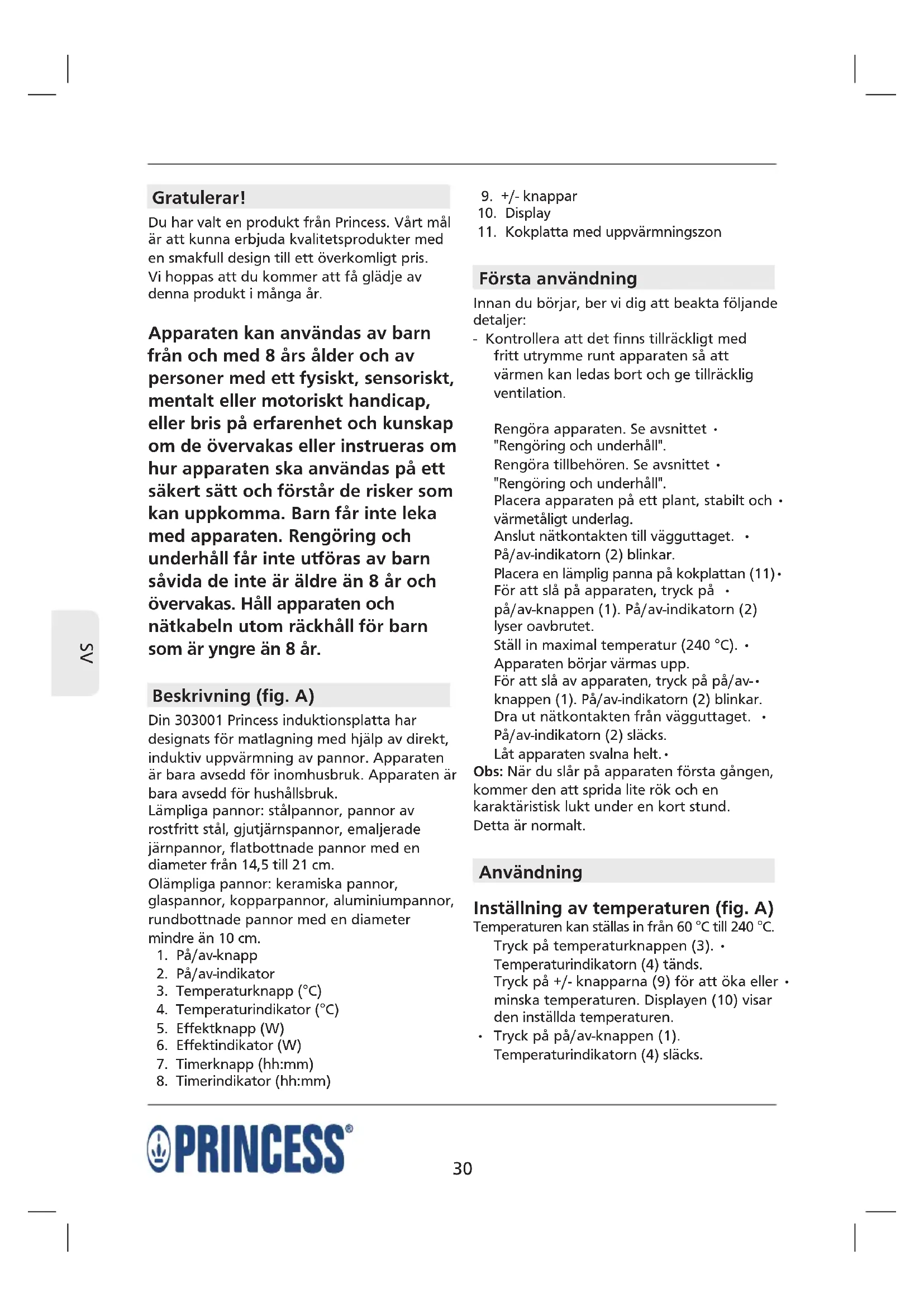 Gratulerar! Du har valt en produkt från Princess. Vårt mål är att kunna erbjuda kvalitetsprodukter med en smakfull design till ett överkomligt pris. Vi hoppas att du kommer att få glädje av denna produkt i många år. Apparaten kan användas av barn från och med 8 års ålder och av personer med ett fysiskt, sensoriskt, mentalt eller motoriskt handicap, eller bris på erfarenhet och kunskap om de övervakas eller instrueras om hur apparaten ska användas på ett säkert sätt och förstår de risker som kan uppkomma. Barn får inte leka med apparaten. Rengöring och underhåll får inte utföras av barn såvida de inte är äldre än 8 år och övervakas. Håll apparaten och nätkabeln utom räckhåll för barn som är yngre än 8 år. Beskrivning (fig. A) Din 303001 Princess induktionsplatta har designats för matlagning med hjälp av direkt, induktiv uppvärmning av pannor. Apparaten är bara avsedd för inomhusbruk. Apparaten är bara avsedd för hushållsbruk. Lämpliga pannor: stålpannor, pannor av rostfritt stål, gjutjärnspannor, emaljerade järnpannor, flatbottnade pannor med en diameter från 14,5 till 21 cm. Olämpliga pannor: keramiska pannor, glaspannor, kopparpannor, aluminiumpannor, rundbottnade pannor med en diameter mindre än 10 cm.