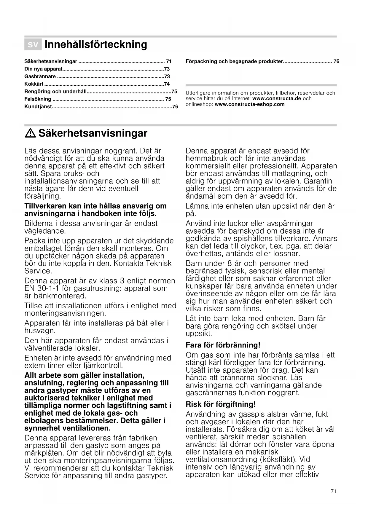 - Ambalaj ve kullanılan gereçler Produktinfo Ürün, aksesuar, yedek parçalar ve hizmetler hakkında daha fazla bilgi için: www.constructa.de ve Online-Mağaza: www.constructa-eshop.com : Güvenlik önerileri Talimatları dikkatle okuyunuz. Ancak bu şekilde cihazın etkin ve güvenli kullanımı mümkün olacaktır. Kullanım ve kurulum talimatlarını saklayınız ve cihazın sahibinin değişmesi durumunda cihazla birlikte veriniz. Bu kılavuzdaki kurallara uyulmadığı takdirde, üretici herhangi bir sorumluluktan muaf olacaktır. Bu talimatlarda yer alan resimler bilgilendirme amaçlıdır. Ürün yerleştirilene kadar koruyucu ambalajı çıkarmayınız. Cihazda herhangi bir hasar fark ettiğiniz takdirde cihazı çalıştırmayınız. Teknik Servisimiz ile irtibata geçiniz. Bu EN 30-1-1 gazlı cihazlar normuna göre p. 82