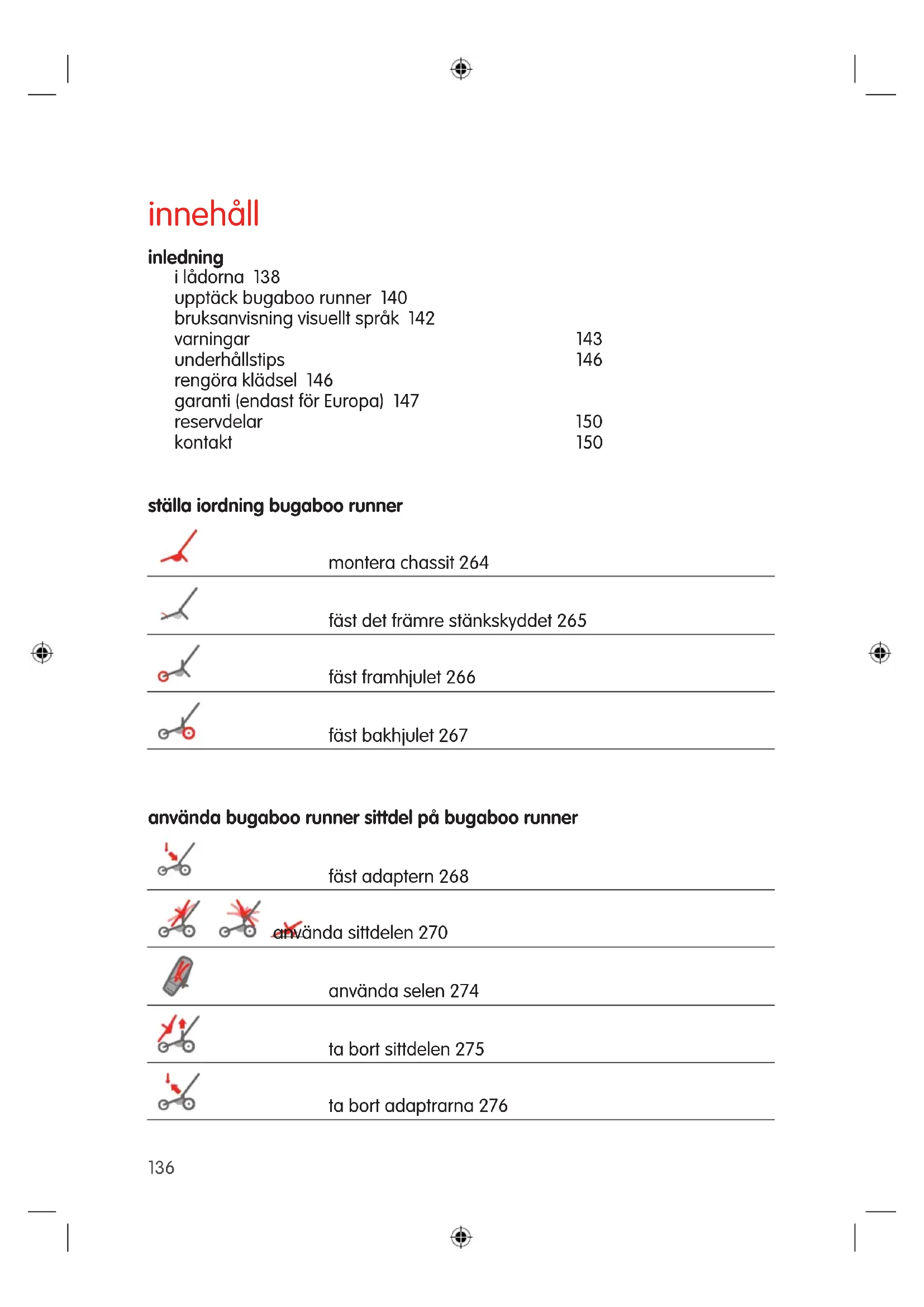 ELinnehåll inledning i lådorna 138 upptäck bugaboo runner 140 bruksanvisning visuellt språk 142 varningar 143 underhållstips 146 rengöra klädsel 146 garanti (endast för Europa) 147 reservdelar 150 kontakt 150 ställa iordning bugaboo runner montera chassit 264 fäst det främre stänkskyddet 265 fäst framhjulet 266 fäst bakhjulet 267 använda bugaboo runner sittdel på bugaboo runner fäst adaptern 268 använda sittdelen 270 använda selen 274 ta bort sittdelen 275 ta bort adaptrarna 276 136använda bugaboo runner använda parkeringsbromsen 277 använda färdbromsen 278 justera styret 279 justera hjulspårningen 280 fälla ihop chassit 281 fälla upp chassit 283 avlägsna bakhjulen 284 avlägsna framhjulet 285 avlägsna korgen under sittdelen 286 montera korgen under sittdelen 288 använda handledsbandet 290 pumpning av hjulen 291