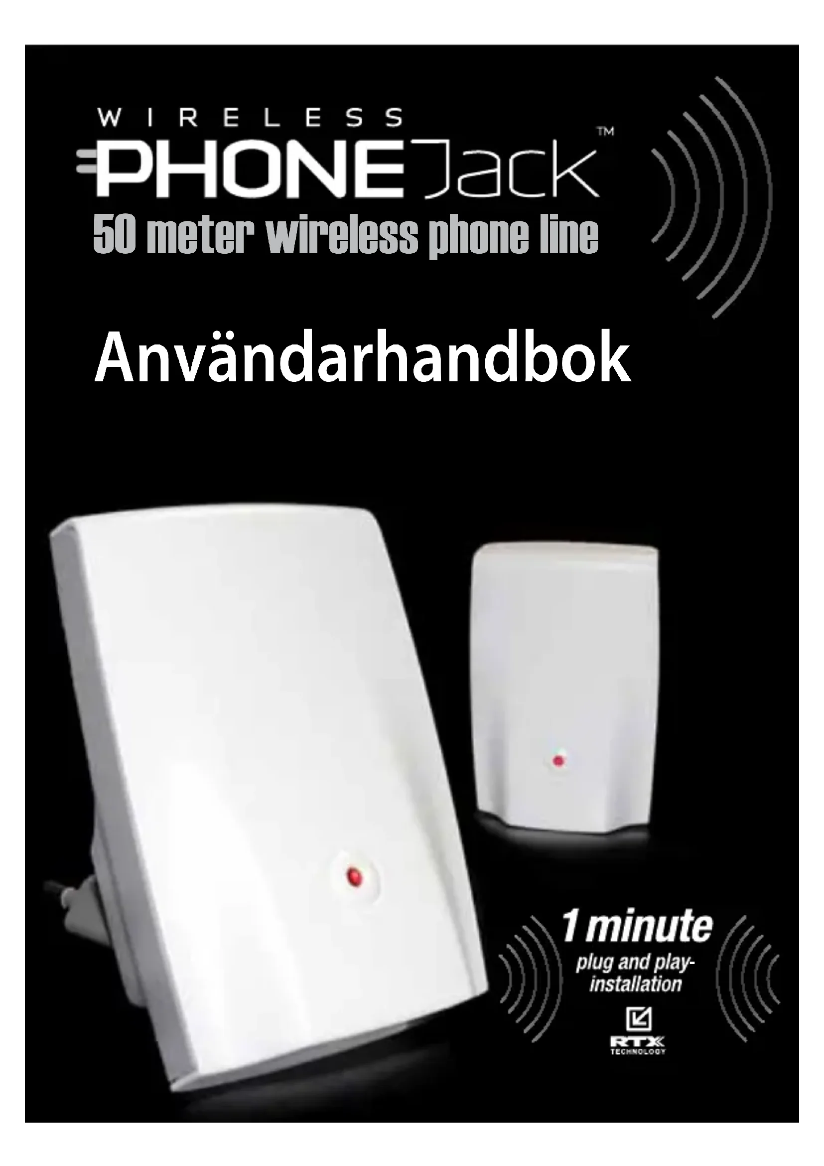 Tack för att du har köpt vår Wireless Phone Jack och/eller en extra anknytningsenhet. Vi hoppas att du får stor glädje av den. Wireless Phone Jack är en trådlös anknytning till telefonjacket eller VoIP-adaptern för vanlig telefon, modem, fax eller digitalbox för satellit-/kabel-tv med inbyggt modem. Läs igenom de följande sidorna noga och följ den information och de anvisningar för användning som bifogats telefonen. Om du behöver närmare information kan du gå in på vår webbplats: www.wireless-phonejack.com CE-symbolen anger att Wireless Phone Jack överensstämmer med kraven i gällande EU-direktiv. Härmed försäkrar vi att Wireless Phone Jack och/eller extra anknytningsenheter är tillverkade i överensstämmelse med gällande krav och andra relevanta bestämmelser i rådets direktiv 1999/5/EG. Copyright ©. Med ensamrätt. Kopiering eller reproduktion av produkten eller tillhörande användarhandbok är inte tillåten. Denna produkt tillverkas av RTX Products A/S.69 UPPACKNING Packa försiktigt upp de olika delarna. Om det finns synliga skador på Wireless Phone Jack ska du INTE försöka använda den. Kontakta genast återförsäljaren eller speditören. FÖRPACKNINGENS INNEHÅLL: