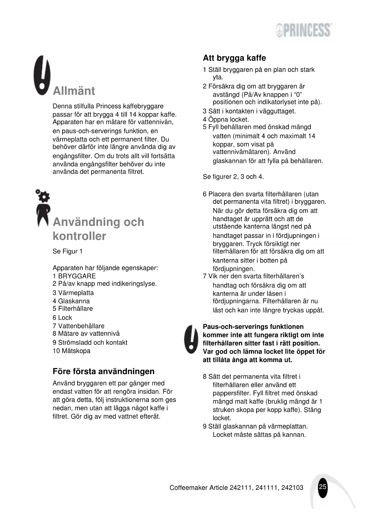 - Pulire ogni giorno accuratamente l’elettrodomestico (vedi ‘Pulizia e manutenzione’) Lasciare raffreddare l’elettrodomestico prima di riporlo, sottoporlo a manutenzione e/o pulizia. L’ambiente Smaltire il materiale di confezionamento, quali la plastica e le scatole, negli appositi contenitori di raccolta. Assicurarsi che l’elettrodomestico venga riutilizzato se si desidera eliminarlo mentre è ancora funzionante o richiede interventi di riparazione minori. Quando l’elettrodomestico giunge al termine della sua vita utile, deve essere smaltito in maniera responsabile, garantendo il riutilizzo del medesimo o di suoi componenti. Non smaltire l’elettrodomestico tra i rifiuti comuni; consegnarlo presso il punto vendita in cui è stato acquisto o presso un punto di raccolta. Contattare le autorità locali per sapere dove si trova il punto di raccolta più vicino.25 Coffeemaker Article 242111, 241111, 242103 Allmänt Denna stilfulla Princess kaffebryggare passar för att brygga 4 till 14 koppar kaffe. Apparaten har en mätare för vattennivån, en paus-och-serverings funktion, en värmeplatta och ett permanent filter. Du behöver därför inte längre använda dig av engångsfilter. Om du trots allt vill fortsätta använda engångsfilter behöver du inte använda det permanenta filtret. Användning och kontroller Se Figur 1 Apparaten har följande egenskaper: 1 BRYGGARE 2 På/av knapp med indikeringslyse. 3 Värmeplatta 4 Glaskanna 5 Filterhållare 6 Lock 7 Vattenbehållare 8 Mätare av vattennivå 9 Strömsladd och kontakt 10 Mätskopa Före första användningen Använd bryggaren ett par gånger med endast vatten för att rengöra insidan. För att göra detta, följ instruktionerna som ges nedan, men utan att lägga något kaffe i filtret. Gör dig av med vattnet efteråt. Att brygga kaffe 1 Ställ bryggaren på en plan och stark yta. 2 Försäkra dig om att bryggaren är avstängd (På/Av knappen i “0” positionen och indikatorlyset inte på). 3 Sätt i kontakten i vägguttaget. 4 Öppna locket. 5 Fyll behållaren med önskad mängd vatten (minimalt 4 och maximalt 14 koppar, som visat på vattennivåmätaren). Använd glaskannan för att fylla på behållaren. Se figurer 2, 3 och 4. 6 Placera den svarta filterhållaren (utan det permanenta vita filtret) i bryggaren. När du gör detta försäkra dig om att handtaget är upprätt och att de utstående kanterna längst ned på handtaget passar in i fördjupningen i bryggaren. Tryck försiktigt ner filterhållaren för att försäkra dig om att kanterna sitter i botten på fördjupningen. 7 Vik ner den svarta filterhållaren’s handtag och försäkra dig om att kanterna är under låsen i fördjupningarna. Filterhållaren är nu låst och kan inte längre tryckas uppåt. Paus-och-serverings funktionen kommer inte att fungera riktigt om inte filterhållaren sitter fast i rätt position. Var god och lämna locket lite öppet för att tillåta ånga att komma ut. 8 Sätt det permanenta vita filtret i filterhållaren eller använd ett pappersfilter. Fyll filtret med önskad mängd malt kaffe (bruklig mängd är 1 struken skopa per kopp kaffe). Stäng locket. 9 Ställ glaskannan på värmeplattan. Locket måste sättas på kannan.26 Coffeemaker Article 242111, 241111, 242103 10 Sätt på bryggaren på (På/Av knappen i “1” positionen). På/Av indikatorn börjar lysa. Kaffet kommer nu bryggas. Värmeplattan kommer att hålla kaffet varmt. 11 Flytta glaskannan från värmeplattan för att hälla upp en kopp kaffe. Bryggaren har en paus-och-serverings funktion. Därför är det inte nödvändigt att låta allt vatten rinna igenom innan kannan flyttas från värmeplattan. 12 Stäng av bryggaren efter användning (ställ På/Av knappen i “0” positionen) och ta ur kontakten från vägguttaget. Underhåll och rengöring