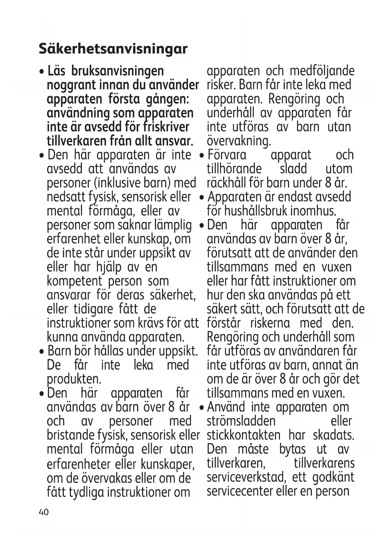 - Den här apparaten får användas av barn över 8 år och av personer med bristande fysisk, sensorisk eller mental förmåga eller utan erfarenheter eller kunskaper, om de övervakas eller om de fått tydliga instruktioner om apparaten och medföljande risker. Barn får inte leka med apparaten. Rengöring och underhåll av apparaten får inte utföras av barn utan övervakning.
