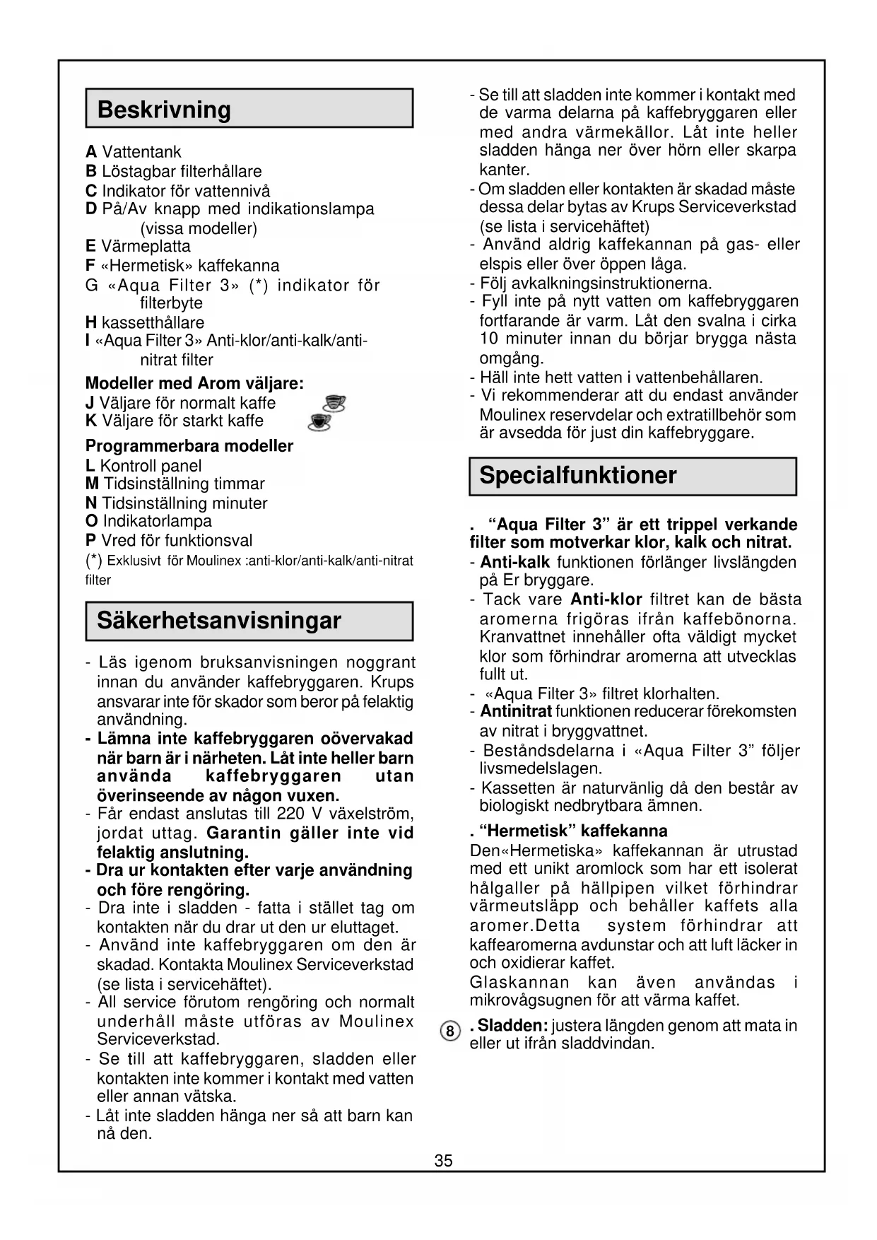 Exklusivt för Moulinex :anti-klor/anti-kalk/anti-nitrat filter Säkerhetsanvisningar - Läs igenom bruksanvisningen noggrant innan du använder kaffebryggaren. Krups ansvarar inte för skador som beror på felaktig användning. - Lämna inte kaffebryggaren oövervakad när barn är i närheten. Låt inte heller barn använda kaffebryggaren utan överinseende av någon vuxen. - Får endast anslutas till 220 V växelström, jordat uttag. Garantin gäller inte vid felaktig anslutning. - Dra ur kontakten efter varje användning och före rengöring. - Dra inte i sladden - fatta i stället tag om kontakten när du drar ut den ur eluttaget. - Använd inte kaffebryggaren om den är skadad. Kontakta Moulinex Serviceverkstad (se lista i servicehäftet). - All service förutom rengöring och normalt underhåll måste utföras av Moulinex Serviceverkstad. - Se till att kaffebryggaren, sladden eller kontakten inte kommer i kontakt med vatten eller annan vätska. - Låt inte sladden hänga ner så att barn kan nå den. - Se till att sladden inte kommer i kontakt med de varma delarna på kaffebryggaren eller med andra värmekällor. Låt inte heller sladden hänga ner över hörn eller skarpa kanter. - Om sladden eller kontakten är skadad måste dessa delar bytas av Krups Serviceverkstad (se lista i servicehäftet) - Använd aldrig kaffekannan på gas- eller elspis eller över öppen låga. - Följ avkalkningsinstruktionerna. - Fyll inte på nytt vatten om kaffebryggaren fortfarande är varm. Låt den svalna i cirka 10 minuter innan du börjar brygga nästa omgång. - Häll inte hett vatten i vattenbehållaren. - Vi rekommenderar att du endast använder Moulinex reservdelar och extratillbehör som är avsedda för just din kaffebryggare. Specialfunktioner . “Aqua Filter 3” är ett trippel verkande filter som motverkar klor, kalk och nitrat. - Anti-kalk funktionen förlänger livslängden på Er bryggare. - Tack vare Anti-klor filtret kan de bästa aromerna frigöras ifrån kaffebönorna. Kranvattnet innehåller ofta väldigt mycket klor som förhindrar aromerna att utvecklas fullt ut. - «Aqua Filter 3» filtret klorhalten. - Antinitrat funktionen reducerar förekomsten av nitrat i bryggvattnet. - Beståndsdelarna i «Aqua Filter 3” följer livsmedelslagen. - Kassetten är naturvänlig då den består av biologiskt nedbrytbara ämnen. . “Hermetisk” kaffekanna Den«Hermetiska» kaffekannan är utrustad med ett unikt aromlock som har ett isolerat hålgaller på hällpipen vilket förhindrar värmeutsläpp och behåller kaffets alla aromer.Detta system förhindrar att kaffearomerna avdunstar och att luft läcker in och oxidierar kaffet. Glaskannan kan även användas i mikrovågsugnen för att värma kaffet. . Sladden: justera längden genom att mata in eller ut ifrån sladdvindan.