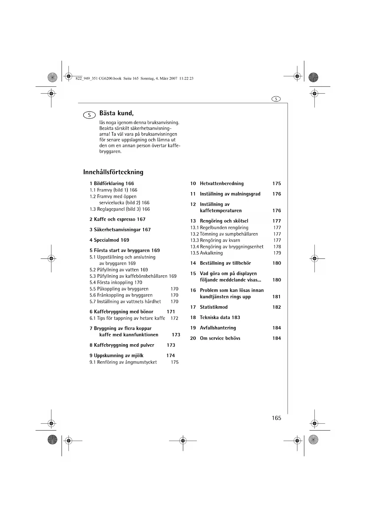 Bästa kund, läs noga igenom denna bruksanvisning. Beakta särskilt säkerhetsanvisning- arna! Ta väl vara på bruksanvisningen för senare uppslagning och lämna ut den om en annan person övertar kaffe- bryggaren. Innehållsförteckning 1 Bildförklaring 166