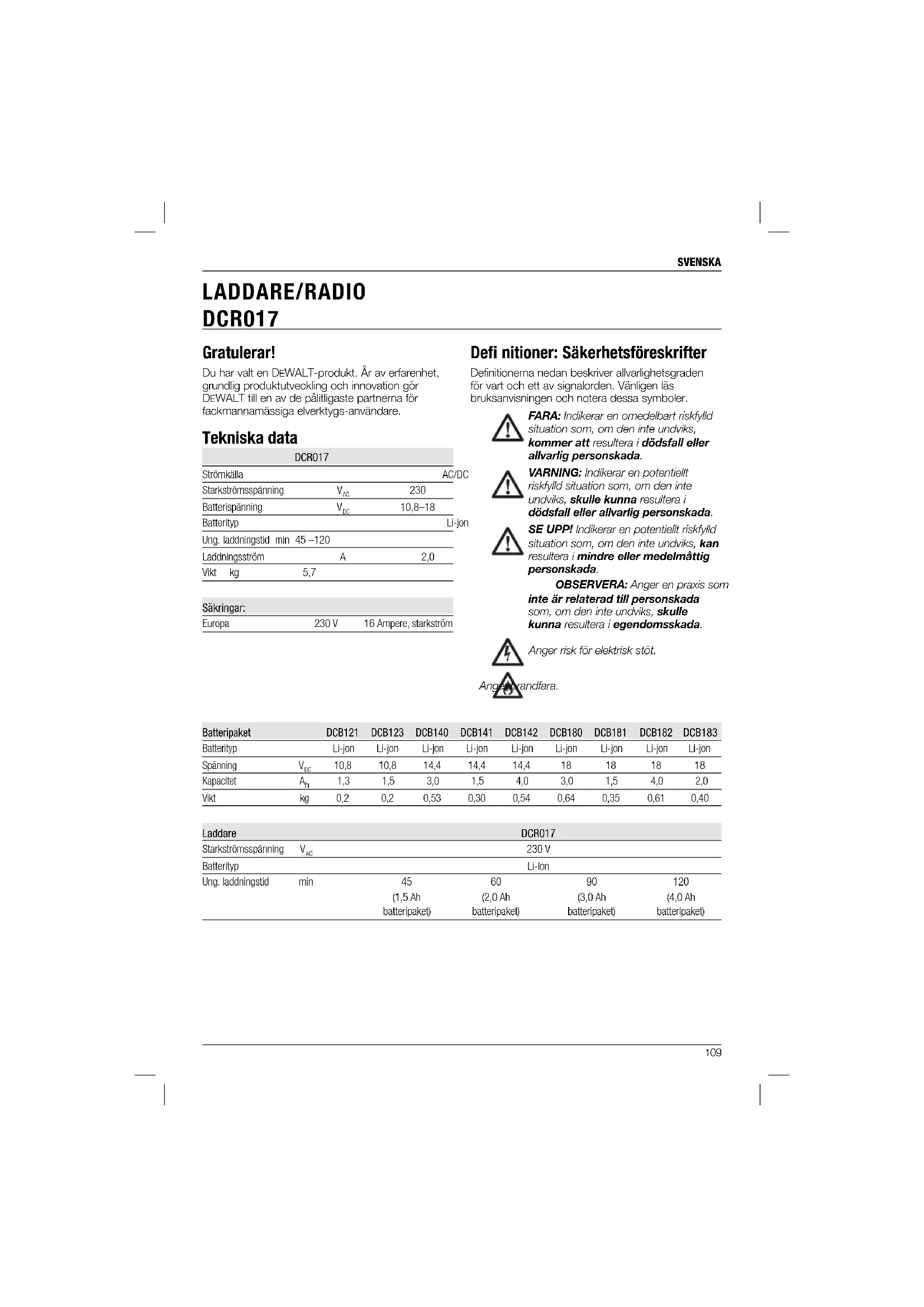 Defi nitioner: Säkerhetsföreskrifter Definitionerna nedan beskriver allvarlighetsgraden för vart och ett av signalorden. Vänligen läs bruksanvisningen och notera dessa symboler. FARA: Indikerar en omedelbart riskfylld situation som, om den inte undviks, kommer att resultera i dödsfall eller allvarlig personskada. VARNING: Indikerar en potentiellt riskfylld situation som, om den inte undviks, skulle kunna resultera i dödsfall eller allvarlig personskada. SE UPP! Indikerar en potentiellt riskfylld situation som, om den inte undviks, kan resultera i mindre eller medelmåttig personskada. OBSERVERA: Anger en praxis som inte är relaterad till personskada som, om den inte undviks, skulle kunna resultera i egendomsskada. Anger risk för elektrisk stöt. Anger brandfara. Gratulerar! Du har valt en DEWALT-produkt. År av erfarenhet, grundlig produktutveckling och innovation gör DEWALT till en av de pålitligaste partnerna för fackmannamässiga elverktygs-användare. Tekniska data DCR017 Strömkälla AC/DC Starkströmsspänning V