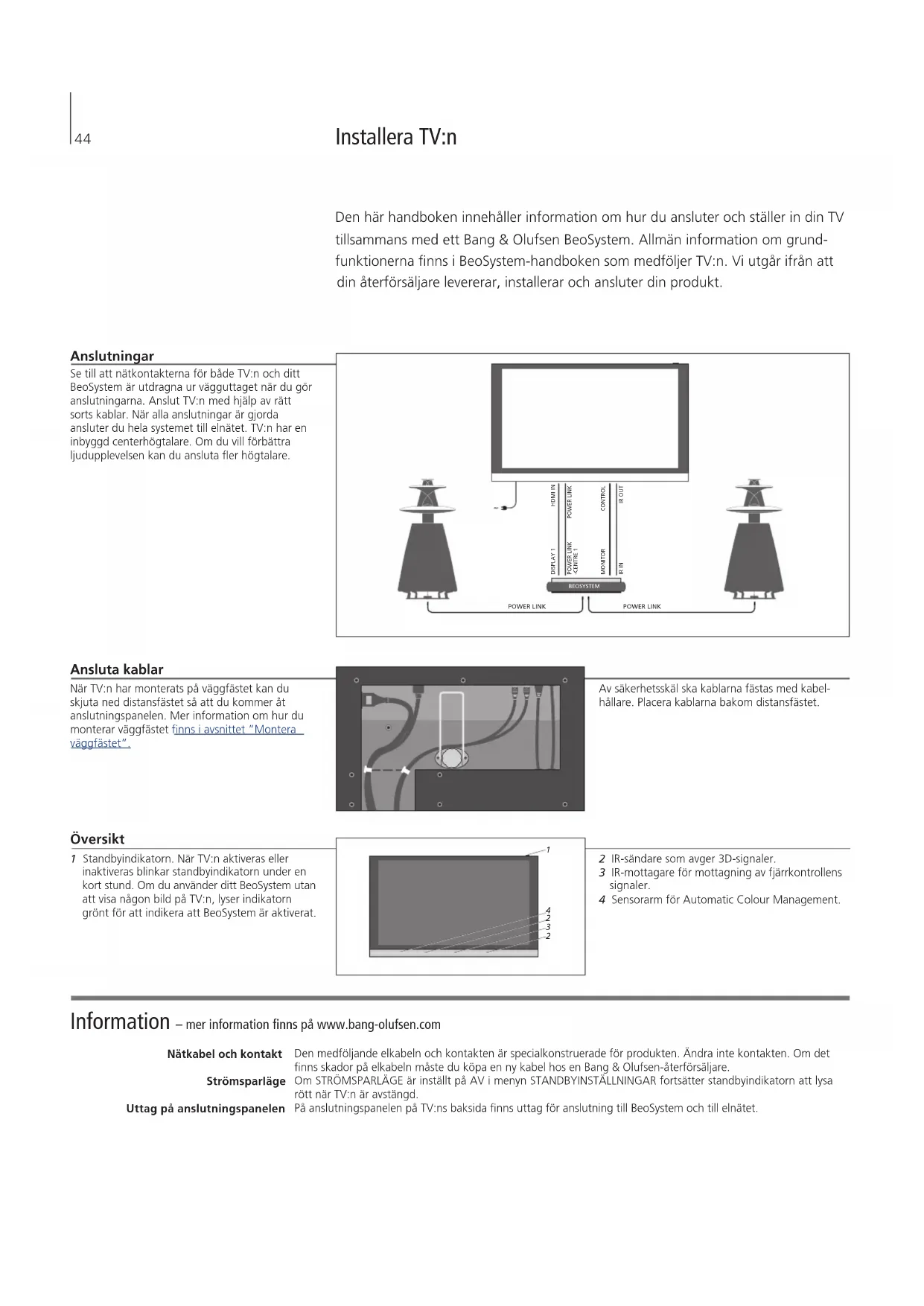 4Information – mer information nns på www.bang-olufsen.com Nätkabel och kontakt Strömsparläge Uttag på anslutningspanelen Den medföljande elkabeln och kontakten är specialkonstruerade för produkten. Ändra inte kontakten. Om det nns skador på elkabeln måste du köpa en ny kabel hos en Bang& Olufsen-återförsäljare. Om STRÖMSPARLÄGE är inställt på AV i menyn STANDBYINSTÄLLNINGAR fortsätter standbyindikatorn att lysa rött när TV:n är avstängd. På anslutningspanelen på TV:ns baksida nns uttag för anslutning till BeoSystem och till elnätet. Installera TV:n Den här handboken innehåller information om hur du ansluter och ställer in din TV tillsammans med ett Bang& Olufsen BeoSystem. Allmän information om grund- funktionerna nns i BeoSystem-handboken som medföljer TV:n. Vi utgår ifrån att din återförsäljare levererar, installerar och ansluter din produkt. Ansluta kablar När TV:n har monterats på väggfästet kan du skjuta ned distansfästet så att du kommer åt anslutningspanelen. Mer information om hur du monterar väggfästet nns i avsnittet ”Montera väggfästet”. Anslutningar Se till att nätkontakterna för både TV:n och ditt BeoSystem är utdragna ur vägguttaget när du gör anslutningarna. Anslut TV:n med hjälp av rätt sorts kablar. När alla anslutningar är gjorda ansluter du hela systemet till elnätet. TV:n har en inbyggd centerhögtalare. Om du vill förbättra ljudupplevelsen kan du ansluta er högtalare. Översikt 1 Standbyindikatorn. När TV:n aktiveras eller inaktiveras blinkar standbyindikatorn under en kort stund. Om du använder ditt BeoSystem utan att visa någon bild på TV:n, lyser indikatorn grönt för att indikera att BeoSystem är aktiverat. 2 IR-sändare som avger 3D-signaler. 3 IR-mottagare för mottagning av fjärrkontrollens signaler. 4 Sensorarm för Automatic Colour Management. Av säkerhetsskäl ska kablarna fästas med kabel- hållare. Placera kablarna bakom distansfästet.
