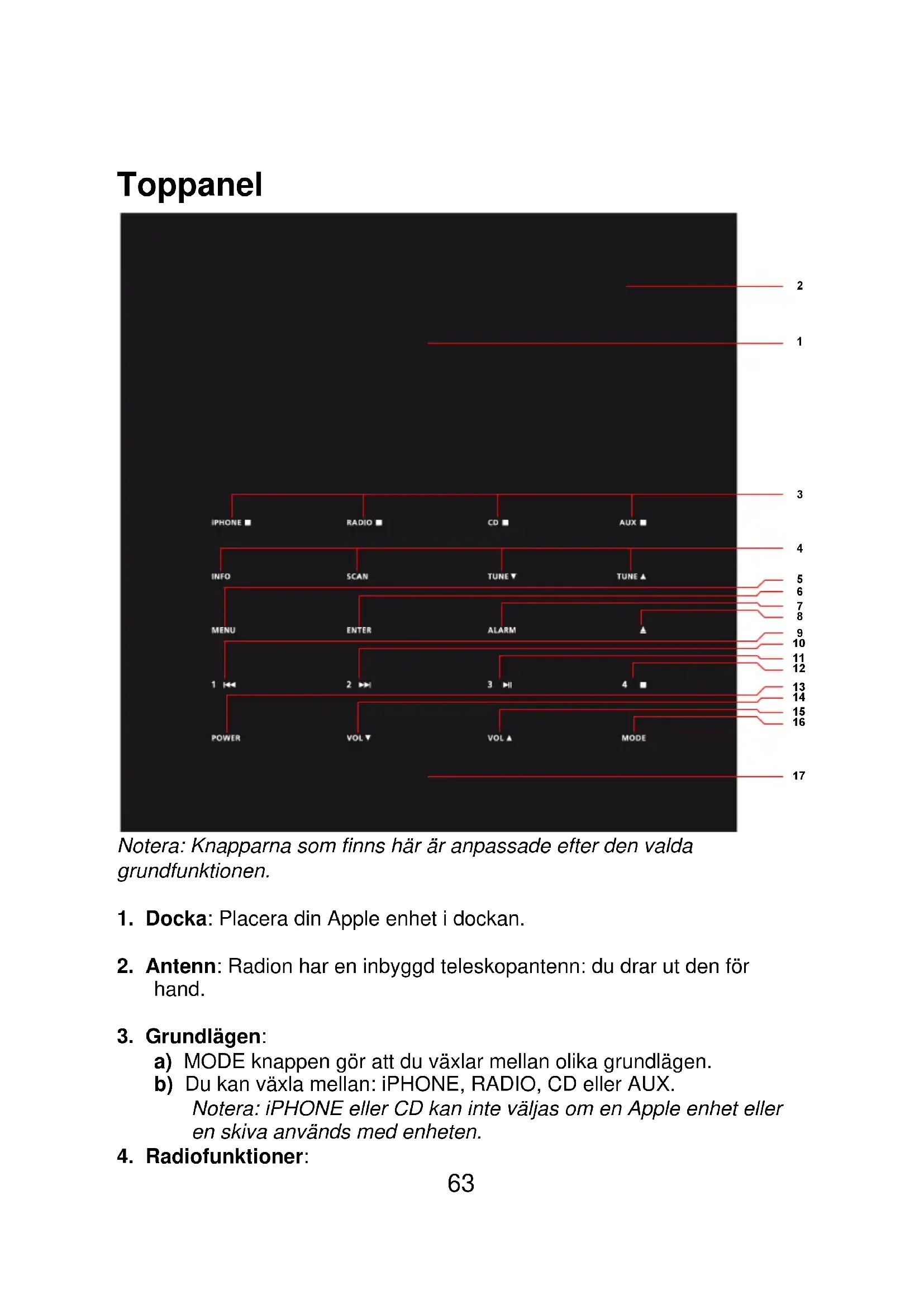 a) MODE knappen gör att du växlar mellan olika grundlägen. b) Du kan växla mellan: iPHONE, RADIO, CD eller AUX. Notera: iPHONE eller CD kan inte väljas om en Apple enhet eller en skiva används med enheten.