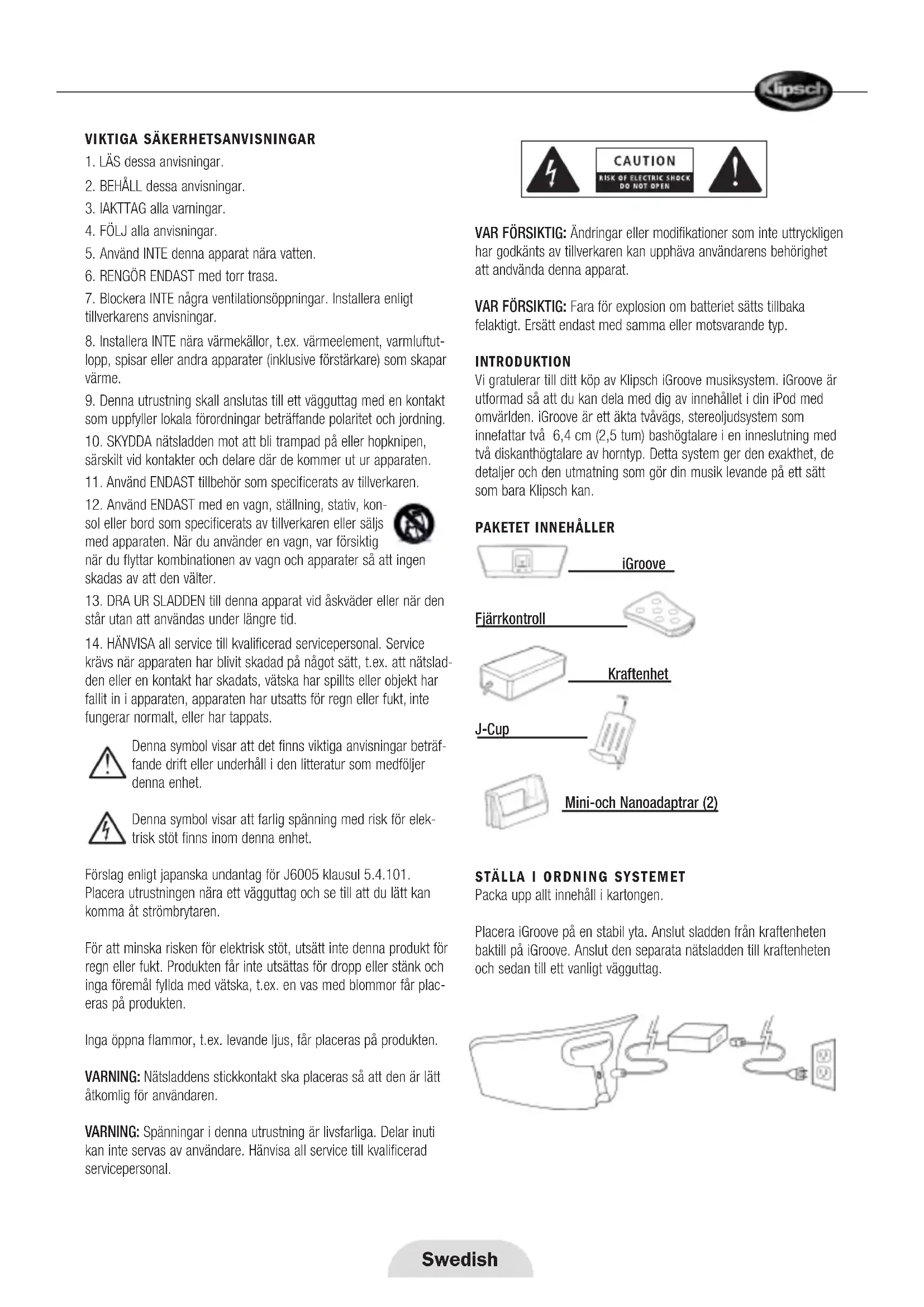 krävs när apparaten har blivit skadad på något sätt, t.ex. att nätslad- den eller en kontakt har skadats, vätska har spillts eller objekt har fallit in i apparaten, apparaten har utsatts för regn eller fukt, inte fungerar normalt, eller har tappats. Denna symbol visar att det finns viktiga anvisningar beträf- fande drift eller underhåll i den litteratur som medföljer denna enhet. Denna symbol visar att farlig spänning med risk för elek- trisk stöt finns inom denna enhet. Förslag enligt japanska undantag för J6005 klausul 5.4.101. Placera utrustningen nära ett vägguttag och se till att du lätt kan komma åt strömbrytaren. För att minska risken för elektrisk stöt, utsätt inte denna produkt för regn eller fukt. Produkten får inte utsättas för dropp eller stänk och inga föremål fyllda med vätska, t.ex. en vas med blommor får plac- eras på produkten. Inga öppna flammor, t.ex. levande ljus, får placeras på produkten. VARNING: Nätsladdens stickkontakt ska placeras så att den är lätt åtkomlig för användaren. VARNING: Spänningar i denna utrustning är livsfarliga. Delar inuti kan inte servas av användare. Hänvisa all service till kvalificerad servicepersonal. VAR FÖRSIKTIG: Ändringar eller modifikationer som inte uttryckligen har godkänts av tillverkaren kan upphäva användarens behörighet att andvända denna apparat. VAR FÖRSIKTIG: Fara för explosion om batteriet sätts tillbaka felaktigt. Ersätt endast med samma eller motsvarande typ. INTRODUKTION Vi gratulerar till ditt köp av Klipsch iGroove musiksystem. iGroove är utformad så att du kan dela med dig av innehållet i din iPod med omvärlden. iGroove är ett äkta tvåvägs, stereoljudsystem som innefattar två 6,4 cm (2,5 tum) bashögtalare i en inneslutning med två diskanthögtalare av horntyp. Detta system ger den exakthet, de detaljer och den utmatning som gör din musik levande på ett sätt som bara Klipsch kan.